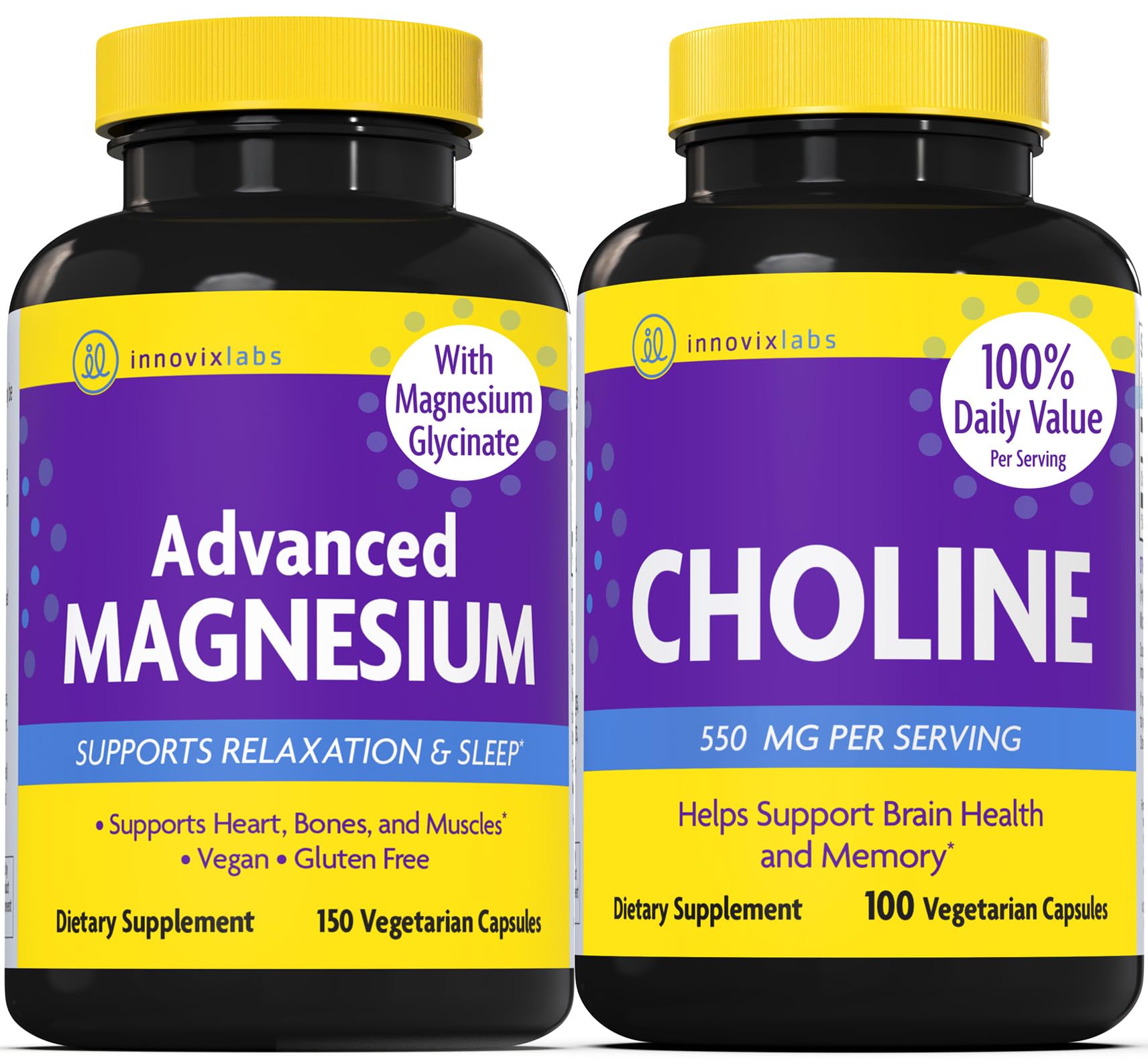 Unlock the full potential of your brain with Choline Supplements, meticulously formulated to support memory, mood, and overall brain health. As an essential nutrient, choline plays a critical role in maintaining youthful mental sharpness, enhancing focus, clarity, and cognitive development. Magnesium is an essential mineral needed for more than 300 biochemical reactions in the body. Yet over 2 3's of us are deficient. Magnesium helps promote: healthy nerve muscle functions, heart cardiovascular health, proper bones teeth formation, energy metabolism protein synthesis, detoxification (Glutathione, your body's master detox antioxidant requires magnesium for its synthesis) and critical for our bodies to naturally relax both nerves muscles to provide a sense of calmness. [ These statements have not been evaluated by the Food and Drug Administration. This product is not intended to diagnose, treat, cure, or prevent any disease.]High Bioavailability Highly absorbable fully chelated magnesium glycinate and magnesium malate supplement that is easily digested and gentle on the stomach helping you to reap the benefits quicker. Sleep Soundly say goodbye to restless nights and wake up feeling refreshed with our Advanced Magnesium supplement for women and men, a formula designed to promote calm restful sleep relaxation and provide defense against leg and muscle cramps. Formulated with Choline Bitartrate to provide maximum potency with fewer pills, delivering higher potency than acetylcholine, ensuring an effective dose with fewer pills. Support Youthful Sharpness with Choline, an essential nutrient that aids focus, clarity, brain development, and mental sharpness. InnovixLabs Choline Supplements are formulated to support memory, mood, brain health and boost cognitive development.