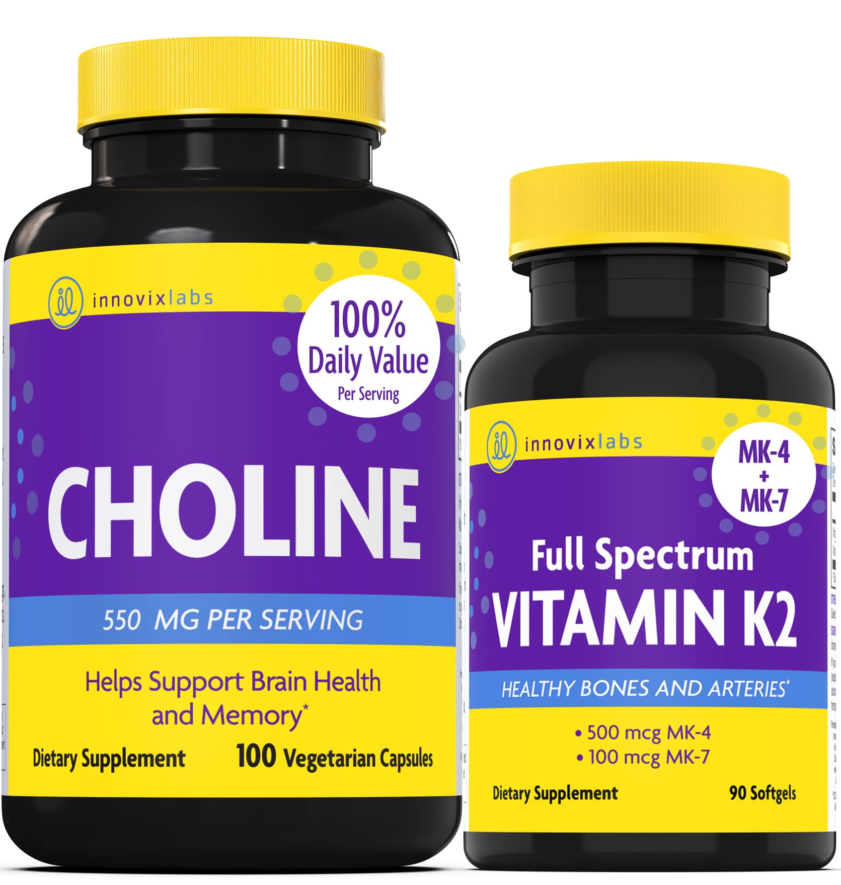 InnovixLabs Choline & Vitamin K2 Bundle Choline Bitartrate 550mg (100 Capsules) Full Spectrum Vitamin K2 (90 Softgels). Supports Memory Mood Brain Health & Boost Cognitive.*