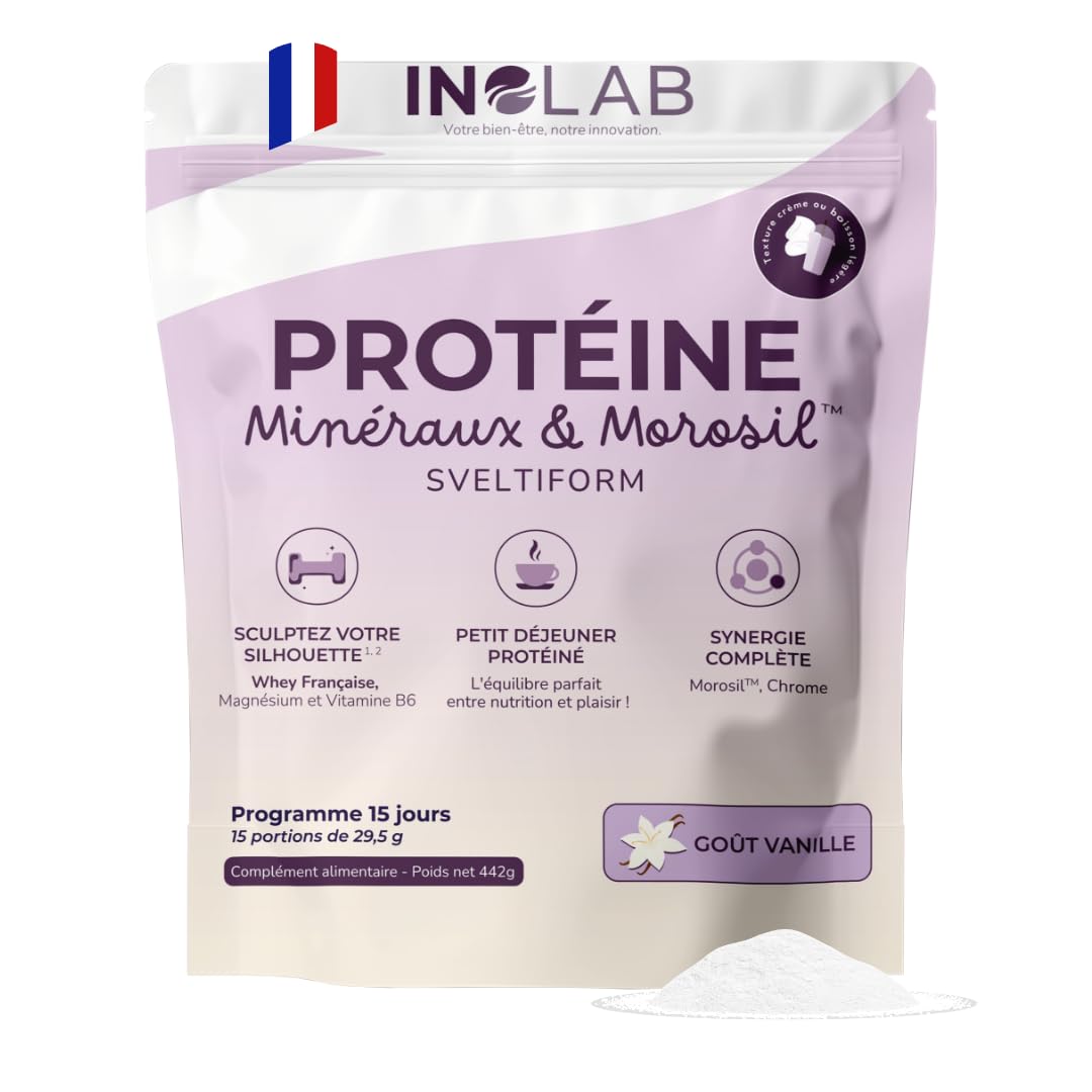 GOURMET PLEASURE QUALITY: Treat yourself to a delicious and effective vanilla slimming break. A protein snack ready in an instant (shaken or simply poured into a glass). Ideal for breakfast to start your day right. No added sugar, gluten-free, and free of controversial additives: a healthy, guilt-free pleasure. Made in France with HACCP GMP certified quality. ? ENERGY METABOLISM: The formula combines easily absorbed organic magnesium glycerophosphate, chromium, vitamin B6, and vitamin C from acerola. These micronutrients boost your metabolism, reduce fatigue, and regulate blood sugar to prevent cravings. Fuel up to lose weight and get in top shape. CLINICALLY PROVEN MOROSIL: Contains 400 mg of Morosil, a patented extract of Sicilian blood orange, to help you lose weight quickly and effectively. This fat-burning ingredient helps significantly reduce fat mass and waist circumference, for a flatter stomach faster. Clinical studies demonstrate visible slimming results in just a few weeks. MUSCLE SATISFACTION: Each serving provides 18 g of protein (French whey protein isolate French milk proteins). This intake helps preserve your muscle mass during a diet and acts as a powerful and effective appetite suppressant to prevent cravings. This innovative complex naturally stimulates GLP-1 activity: Ideal for both bodybuilding and weight loss programs. COMPLETE FIGURE ALLY: Sveltiform is a unique 5-in-1 supplement that combines delicious proteins (milk and whey protein isolate), a powerful weight loss fat burner (Morosil), magnesium glycerophosphate (which promotes protein synthesis), chromium picolinate (which regulates blood sugar), and vitamin C from acerola. It helps you slim down, sculpt your body for fast and effective weight loss, while preserving your muscle mass and energy.PLAISIR GOURMAND QUALITÉ : Offrez-vous une pause minceur à la vanille, à la fois délicieuse et efficace. Une collation protéinée prête en un instant (au shaker ou simplement dans un verre). Idéale au petit-déjeuner pour bien démarrer la journée. Sans sucre ajouté, sans gluten et sans additifs controversés : un plaisir sain, sans culpabilité. Fabriqué en France, avec une qualité certifiée HACCP GMP.fs controversés : un plaisir sain sans culpabilité. Fabriqué en France avec une qualité certifiée HACCP GMP. ? ÉNERGIE MÉTABOLISME : La formule associe magnésium organique assimilable glycérophosphate, chrome, vitamine B6 et vitamine C issue de l'acérola. Ces micronutriments donnent un coup de boost à votre métabolisme, réduisent la fatigue et régulent le sucre sanguin pour éviter les fringales. Faites le plein d'énergie pour maigrir et vous gainer en pleine forme. MOROSIL CLINIQUEMENT PROUVÉ : Contient 400 mg de Morosil, un extrait breveté d'orange sanguine de Sicile, pour vous aider à maigrir rapidement efficacement. Cet ingrédient brûle-graisse aide à réduire significativement la masse grasse et le tour de taille, pour un ventre plat plus rapidement. Des études cliniques démontrent des résultats minceur visibles en quelques semaines. MUSCLES SATIÉTÉ : Chaque dose apporte 18 g de protéines (isolate whey protein française protéines de lait françaises). Cet apport aide à préserver votre masse musculaire pendant un régime et agit comme un coupe-faim puissant et efficace pour éviter les fringales. Ce complexe innovant stimule naturellement l'activité du GLP-1 : Idéal pour la musculation comme pour un programme minceur. ALLIÉ SILHOUETTE COMPLET : Sveltiform est un complément 5-en-1 unique qui combine des protéines savoureuses (lait et whey protein isolate), un brûleur de graisse perte de poids puissant (Morosil), du magnésium glycérophosphate (favorisant la synthèse des protéines), du chrome picolinate (régulateur de la glycémie) et de la vitamine C issue de l'acérola. Il vous aide à affiner votre silhouette, sculpter votre corps pour une perte de poids rapide et efficace, tout en préservant votre masse musculaire et votre énergie.INOLAB Protéine Minceur 360 Pure Whey Isolate Morosil Magnésium B6 Chrome Acérola Musculation perte de poids Énergie 15 encas vanille gourmand