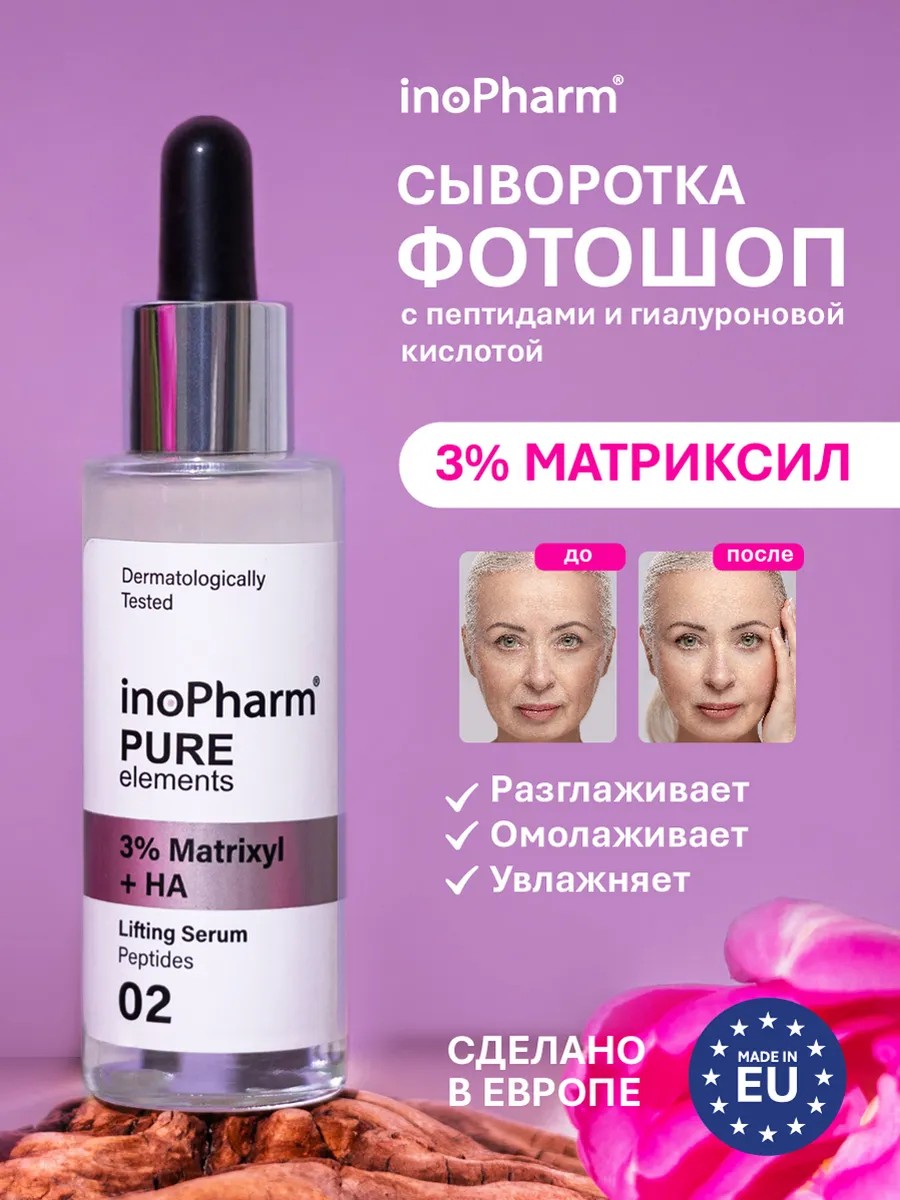 Увлажняющая и восстанавливающая сыворотка для лица с эффектом ботокса inoPharm PURE elements, с 3% матриксилом и гиалуроновой кислотой эффективно борется с мимическими морщинами и потерей упругости, обеспечивая видимый лифтинг эффект и омолаживая кожу.