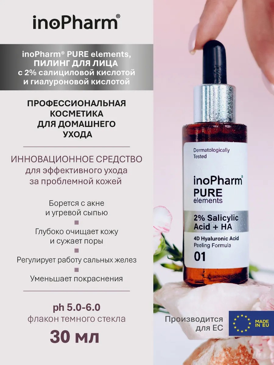 Пилинг для лица с 2% салициловой и гиалуроновой кислотой inoPharm PURE elements - инновационное средство для ухода за проблемной кожей. Подходит для комбинированной и жирной кожи, склонной к появлению черных точек, сального блеска, акне и постакне. Сыворотка снижает выработку себума, борется с воспалениями и избыточной жирностью. Комбинация 2% салициловой кислоты и комплекса 4D гиалуроновой кислоты значительно улучшает состояние кожи: воспаления становятся менее заметными, кожа приобретает здоровый, гладкий и свежий вид.