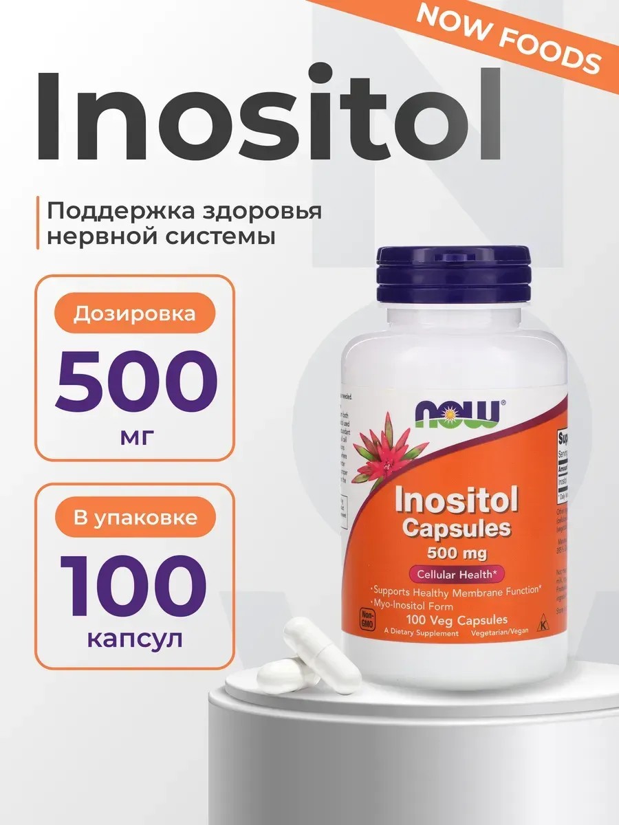 NOW Inositol Capsules 500 mg - это продукт высочайшего качества от фирмы, которой можно доверять. Инозитол относится с группе витаминов B. В каждой капсуле 500 вещества в виде мио-инозитола. NOW Inositol оказывает важное воздействие на здоровье женского организма: способствует точной регуляции вашего менструального цикла, играет важнейшую роль в восстановлении и работе функции яичников и созревании яйцеклетки, а также увеличивает частоту наступления беременности, участвует в синтезе эстрогенов. Также инозитол снижает нервное напряжение, снижает стресс и улучшает сон. Приём витамина оказывает положительное влияние на состояние кожи, ногтей и волос. В каждой банке 100 вегетарианских капсул.