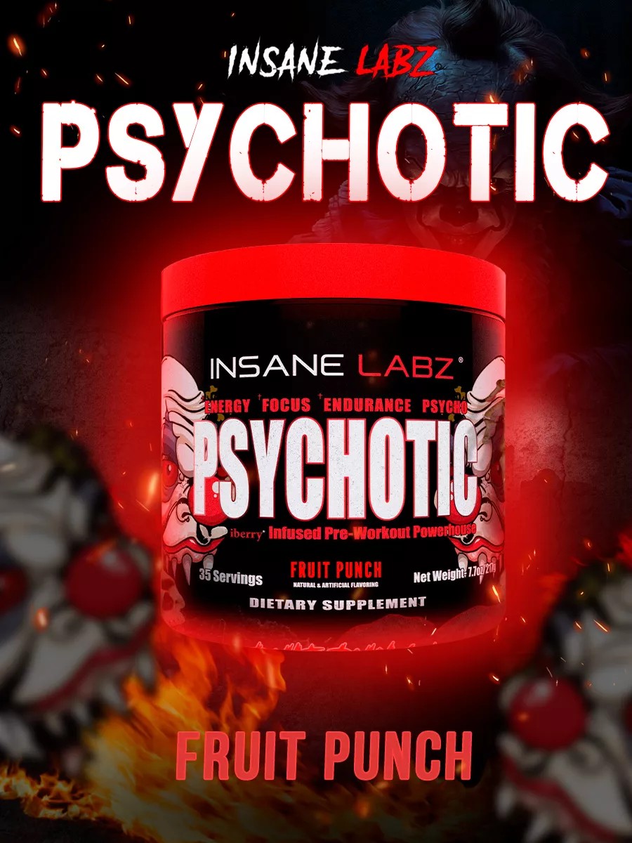 Предтренировочный комплекс Insane Labs Psychotic - даёт мощный выброс энергии, фокусировки и эйфории в течении 3 часов, забудьте про Мезаморф и Девкон, отныне предтрен Psychotic Ваш любимый психо-предтрен, порвите свое сознание, ощутите ярость безумия workout в зале, рвите железо! Использовать только настоящим психам, фанатикам зала, почувствуй себя на курсе без курса :) Эффекты предтреник психотик : Мощный выброс энергии; Концентрация и ясность ума; Повышение работоспособности; Улучшение настроения и эйфория; Продолжительность действия до 3 часов! Бета аланин — мышечный стимулятор, продлевает тренировку и увеличивает количество подходов и повторений. Повышает концентрацию карнозина в мышцах, который является буфером молочной кислоты. Способствует увеличению чувствительности кальциевых каналов, что повышает сократительную способность мышц. Креатин (creatine) Моногидрат — настоящий природный анаболик! Увеличивает пампы, выносливость и силу мгновенно и имеет накопительный эффект. Кофеин (caffeine) - энергетик спортивный, силовой, наиболее популярный стимулятор ЦНС. Разгоняет метаболизм и обеспечивает длительное поступление энергии. AMPiberry — запатентованная смесь Ягод Можжевельника и дрожжей. Оказывает противовоспалительное, антиоксидантное и болеутоляющее действие. Имеет анаболический эффект. r-b-methylphenylethylamine — стимулятор нервной системы без побочных эффектов! Вызывает чувство насыщения и лёгкой эйфории, разгоняет метаболизм. ДМАЕ — повышает настроение, complex улучшает внимание и память. Горденин — спортивный жиросжигающий компонент, эффект которого обеспечивается через стимуляцию ЦНС и выработку норадреналина. Настраивает организм на тренинг и энергорасход за счёт жировых отложений. Экстракт Яда Дьявола — а именно Респрин — компонент, который оказывает успокаивающее действие на нервную систему. Избавляет от тревоги и повышает ясность ума, нормализует кровяное давление. Гиперзин — улучшает когнитивные функции.