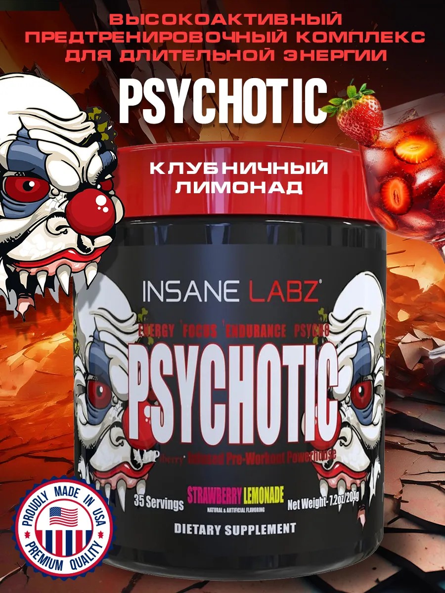 Инновационная американская новинка Insane Labz Psychotic – это невероятно вкусный и самый безумный стимулятор на рынке спортивного питания! Даёт мощный выброс энергии, фокусировки и эйфории в течении очень длительного времени! Может сочетаться с любым предтреном или пампилкой.