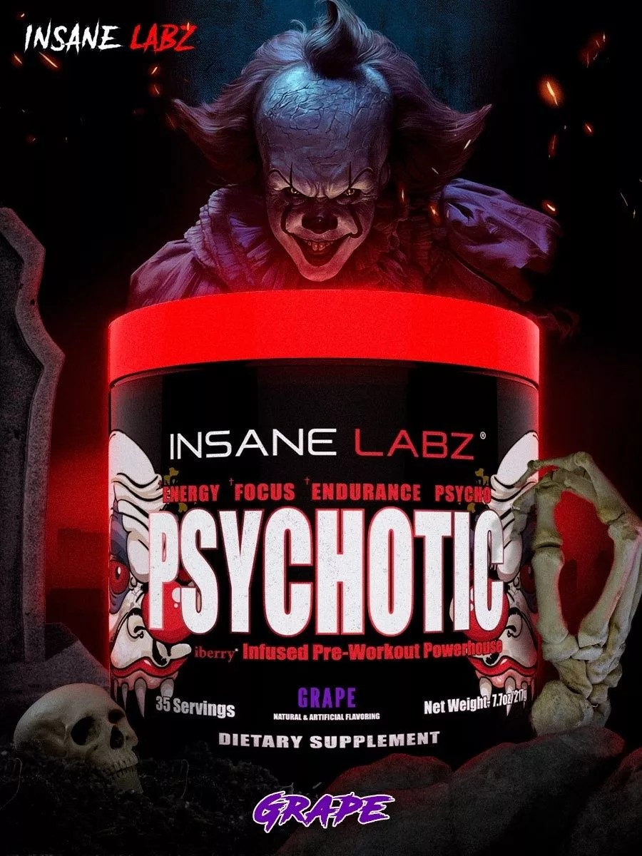 Предтренировочный комплекс Insane Labs Psychotic - даёт мощный выброс энергии, фокусировки и эйфории в течении 3 часов, забудьте про Мезаморф и Девкон, отныне предтрен Psychotic Ваш любимый психо-предтрен, порвите свое сознание, ощутите ярость безумия workout в зале, рвите железо! Использовать только настоящим психам, фанатикам зала, почувствуй себя на курсе без курса :) Эффекты предтреник психотик : Мощный выброс энергии; Концентрация и ясность ума; Повышение работоспособности; Улучшение настроения и эйфория; Продолжительность действия до 3 часов! Бета аланин — мышечный стимулятор, продлевает тренировку и увеличивает количество подходов и повторений. Повышает концентрацию карнозина в мышцах, который является буфером молочной кислоты. Способствует увеличению чувствительности кальциевых каналов, что повышает сократительную способность мышц. Креатин (creatine) Моногидрат — настоящий природный анаболик! Увеличивает пампы, выносливость и силу мгновенно и имеет накопительный эффект. Кофеин (caffeine) - энергетик спортивный, силовой, наиболее популярный стимулятор ЦНС. Разгоняет метаболизм и обеспечивает длительное поступление энергии. AMPiberry — запатентованная смесь Ягод Можжевельника и дрожжей. Оказывает противовоспалительное, антиоксидантное и болеутоляющее действие. Имеет анаболический эффект. r-b-methylphenylethylamine — стимулятор нервной системы без побочных эффектов! Вызывает чувство насыщения и лёгкой эйфории, разгоняет метаболизм. ДМАЕ — повышает настроение, complex улучшает внимание и память. Горденин — спортивный жиросжигающий компонент, эффект которого обеспечивается через стимуляцию ЦНС и выработку норадреналина. Настраивает организм на тренинг и энергорасход за счёт жировых отложений. Экстракт Яда Дьявола — а именно Респрин — компонент, который оказывает успокаивающее действие на нервную систему. Избавляет от тревоги и повышает ясность ума, нормализует кровяное давление. Гиперзин — улучшает когнитивные функции.