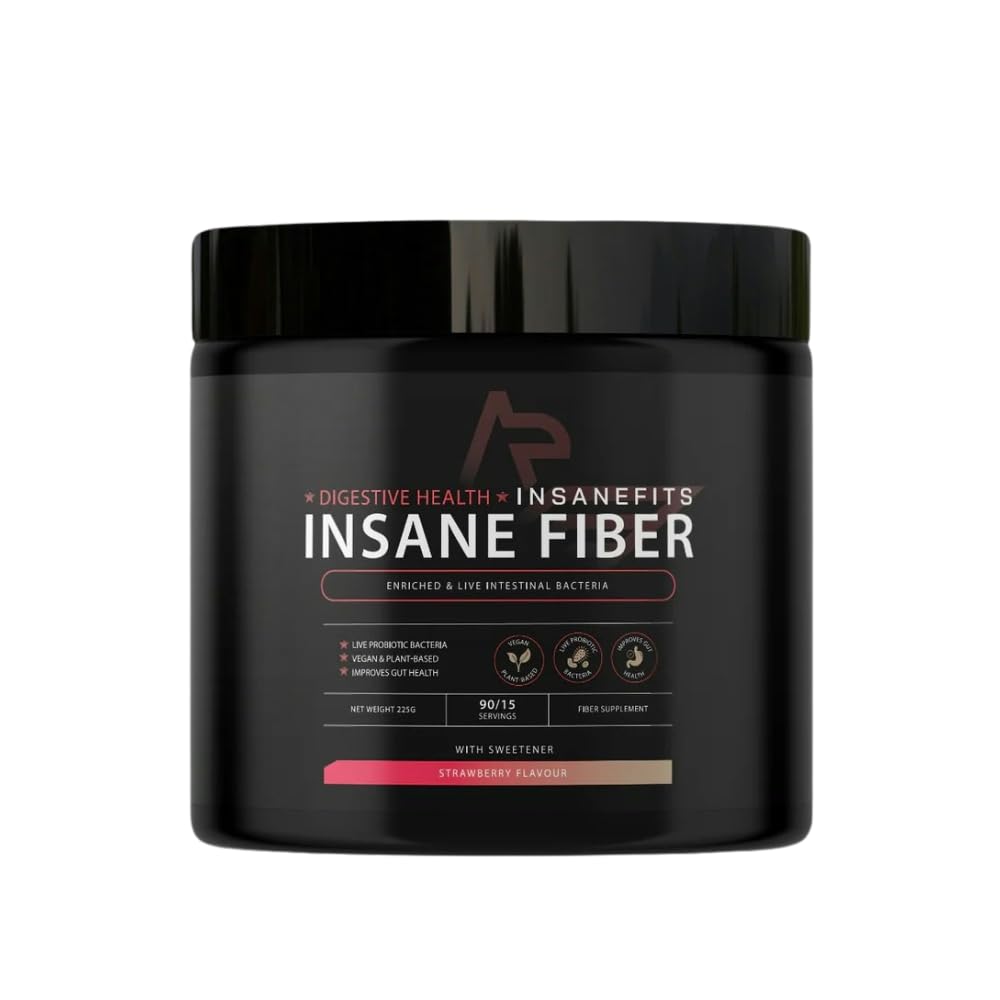 INSANE Fiber Dietary Supplement Live Gut Bacteria. A formula for your needs and institutions. Unique composition: enriched with chia seeds and live gut bacteria. What is it for? For people experiencing digestive difficulties or blockages. Following a diet or wanting to lose weight. A natural way to maintain cholesterol balance. Create a healthy gut microbiota. To improve well-being and energy levels. Why use Insane Fiber? Most people consume too little fiber daily. As a result, there can be problems with bowel movements, which can also affect digestion, the gut microbiota, and even energy levels or the immune system. This combination: Supports gentle digestion and bowel function. Provides a lasting feeling of security—ideal for weight management. Regular blood cholesterol levels. Nourishes "good" gut bacteria. Promotes a balanced gut microbiota and stronger immunity. Benefits for daily use. Clinically proven ingredients. 100 free of added sugar, preservatives, or GMOs. Suitable for vegans and vegetarians. Made without binders, fillers, or hormones. Easy dosing: powder with a scoop inside. Directions: For digestive health and cholesterol control - 5 g (0.5 scoop) twice a day, 20 to 30 minutes before meals, with 1 to 2 glasses of water. Enough for 45 days. For weight loss - 15 g (1 scoop) three times a day, 20 to 30 minutes before meals, while following a balanced diet. 15 days is sufficient. However, without a balanced diet, you will not feel the effect. It will help you regulate your blood sugar levels. Ingredients: White plantain seeds. Chickpea inulin. Glucomannan. Chia seeds. Live bacteria: Lactobacillus acidophilus, Bifidobacterium lactis. Strawberry juice powder, natural flavors. Citric acid, beetroot tincture, sweetener: sucralose. Net weight: 225 g. Depending on usage, a 15, 45, or 90-day supply is sufficient. Suitable for vegans and vegetarians. Warnings: Children are not recommended to take more than 0.5 g (2.5 g) per day. If you have difficulty moving, be careful of possible choking. When using Insane Fiber, it is necessary to drink 1.5 to 2 liters of water per day. Do not use if you are hypersensitive to any of the product's ingredients. A varied and balanced diet and a healthy lifestyle are important. Storage conditions: Store at a temperature not exceeding 25 C, in a dry place protected from direct sunlight. Keep out of reach of children. INGREDIENTS: White plantain, holly, inulin, glucomannan, chia seeds, live bacteria: Lactobacillus acidophilus, Bifidobacterium lactis, strawberry juice powder, natural citric acid flavoring, beetroot tincture, sweetener: sucralose. DIRECTIONS: For digestive health and cholesterol control - 5 g (0.5 serving) twice a day, 20 to 30 minutes before meals, with 1 to 2 glasses of water. Enough for 45 days. SAFETY WARNING Children are not recommended to take more than 0.5 g (2.5 g) per day. If you have difficulty moving, be careful of the possibility of choking. When using Insane Fiber, it is necessary to drink 1.5 to 2 liters of water per day. Do not use if you are hypersensitive to any of the product's ingredients. A varied and balanced diet and a healthy lifestyle are important. See moreVegan, sugar-free, and non-GMO – no fillers, binders, or hormones. Helps regulate cholesterol levels with clinically proven ingredients. Boosts health and immunity with nourishing gut bacteria. Promotes satiety and weight management: ideal before meals for appetite fluctuations. Supports digestion and regular movement with natural fibers and probiotics.INSANEFITS Insane Fiber - Bacteria Intestinal Live - Une formule pour la santé digestive - Saveur fraise - 225 gDESCRIPTION DU PRODUIT DESCRIPTION DU PRODUIT Supplément alimentaire en fibre INSANE Bactéries intestinales vivantes. Une formule pour vos besoins et vos institutions. Composition unique : enrichie en graines de chia et bactéries intestinales vivantes. Qu'en est-il ? Pour les personnes expérimentant les difficultés digestives ou les blocages. Suivez un régime alimentaire ou souhaitez perdre du poids. Un look naturel pour maintenir l'équilibre du cholestérol. Créer des microbiotes intestinaux sains. Pour améliorer les niveaux de bien-être et d'énergie Pourquoi utiliser la fibre Insane ? La plupart des gens consomment trop peu de fibres par jour - En conséquence, il peut y avoir des problèmes avec les mouvements de bowel et cela peut également affecter la digestion, le microbiote intestinal et même les niveaux d'énergie ou le système immunitaire. Cette combinaison : Soutient la digestion en douceur et la fonction bowel Offre une sensation de sécurité durable - Idéal pour contrôler le poids. Niveaux de cholestérol sanguins réguliers. Alimentation « bonne » bactéries intestinales. Favorise l'équilibre de la microflore intestinale et une immunité plus forte. Avantages pour une utilisation quotidienne. Ingrédients cliniquement prouvés. 100 sans sucre, conservateur ou OGM ajouté. Convient aux végétaliens et aux végétaliens. Fabriqué sans liants, sans agents de remplissage ni hormones. Dosage facile : poudre avec un scoop à l'intérieur. Mode d'emploi : Pour la santé digestive et le contrôle du cholestérol - 5 g (0,5 dose) 2 fois par jour, 20 à 30 minutes avant les repas, avec 1 à 2 verres d'eau. Assez pour 45 jours. Pour perdre du poids – 15 g (1 dose) 3 fois par jour, 20 à 30 minutes avant de manger, suivez un régime alimentaire équilibré. 15 jours suffisent. Cependant, sans alimentation équilibrée, vous ne sentirez pas l'effet. Il vous aidera à réguler les niveaux de sucre. Ingrédients : Bouchons de plantain blancs. Chickpea inuline Glucomannane. Graines de chia. Bactéries vivantes : Lactobacillus acidophilus, Bifidobacterium lactis Poudre de jus de fraise, arômes naturels. Acide citrique, teinture de beetroot, adoucissant : sucralose. Capacité nette : 225 g. En fonction de l'utilisation, il suffit de 15, 45 ou 90 jours. Convient aux végétaliens e