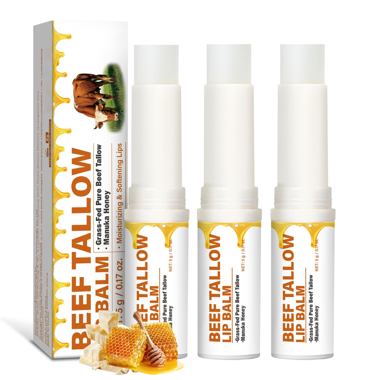 Deeply Moisturizing and Long-lasting Moisture Retention Tallow lip balm can quickly penetrate the skin around the lips, replenish moisture and oil, form a protective film, effectively prevent moisture loss, and keep your lips moist and soft Soften the Lips and Improve Texture Long-term use of beef tallow lip balm can deeply nourish the skin around the lips, soften rough keratin, improve the dry and rough texture of the lips, and restore their smoothness and fineness Natural Ingredients, a Reassuring Choice Our beef tallow and honey lip balm is carefully formulated with grass-fed pure tallow and beeswax, supplemented with shea butter extract and horn shark, providing you with a reassuring and gentle option for lip care. Portable Design, Always Ready for Care The naturals tallow lip balm is designed to be compact and lightweight, making it easy to carry. Whether at work, during travel or in daily life, it can provide timely and considerate care for the lips. Product Include: 3 Beef Tallow Lip Balm[Easy to Carry]: Tallow lip balm is designed to be compact and portable, making it convenient for you to carry it anytime and anywhere. Whether you are at work, traveling or going out on a daily basis, you can take out the beef tallow lip balm in time and use it to provide immediate moisture and protection for your lips. [Widely Used]: Tallow lip balm is suitable for people of all ages and genders. It is an ideal choice for the cold and dry autumn and winter. Beef tallow lip balm can be part of your daily self-care routine. [Natural Ingredients]: The beef tallow and honey lip balm is carefully formulated with grass-fed pure tallow and beeswax, and is supplemented with shea butter extract and horn shark. Naturals tallow lip balm provides gentle and safe care for your lips, and can be used with confidence even for sensitive lips. [Make Lips Soften ]: Continuous use of our beef tallow lip balm can soften the old keratin on the lips, improve the rough texture of the lips, make the lips more delicate and smooth, create a perfect foundation for subsequent lip makeup, and showcase charming appeal. [Deeply Moisturize Lips]: Tallow lip balm can quickly penetrate the skin around the lips, replenish moisture and nutrients, effectively prevent dryness and peeling of the lips, keep your lips moist and soft for a long time, and bid farewell to chapping lips.
