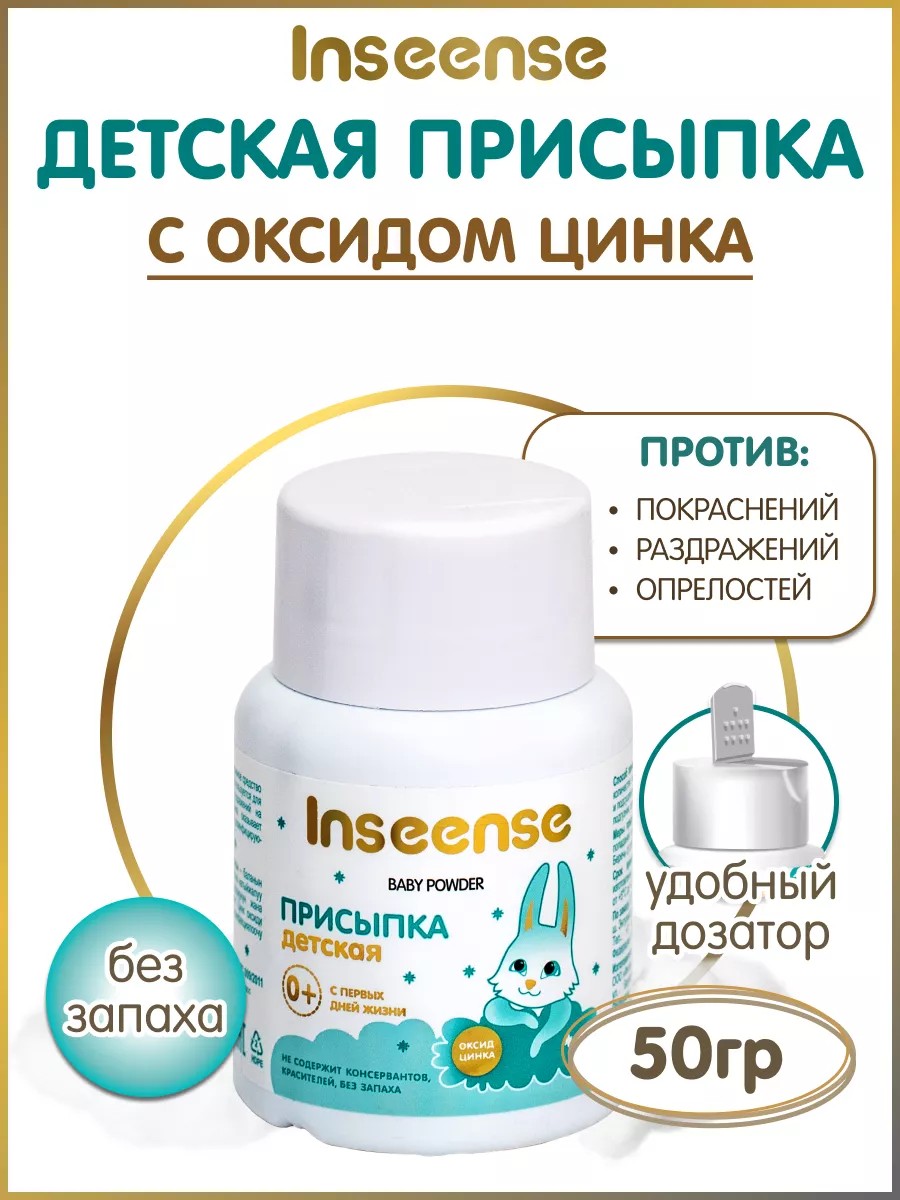 The powder spreads easily over baby's skin, absorbs excess moisture, and does not form clumps. With regular use of Inseense baby powder, inflammation and redness subside. Baby's skin becomes soft and supple. Directions: Apply a small amount to clean and dry baby skin under the diaper, around the knees, elbows, and neck. Ingredients: Talc, zinc oxide, starch.