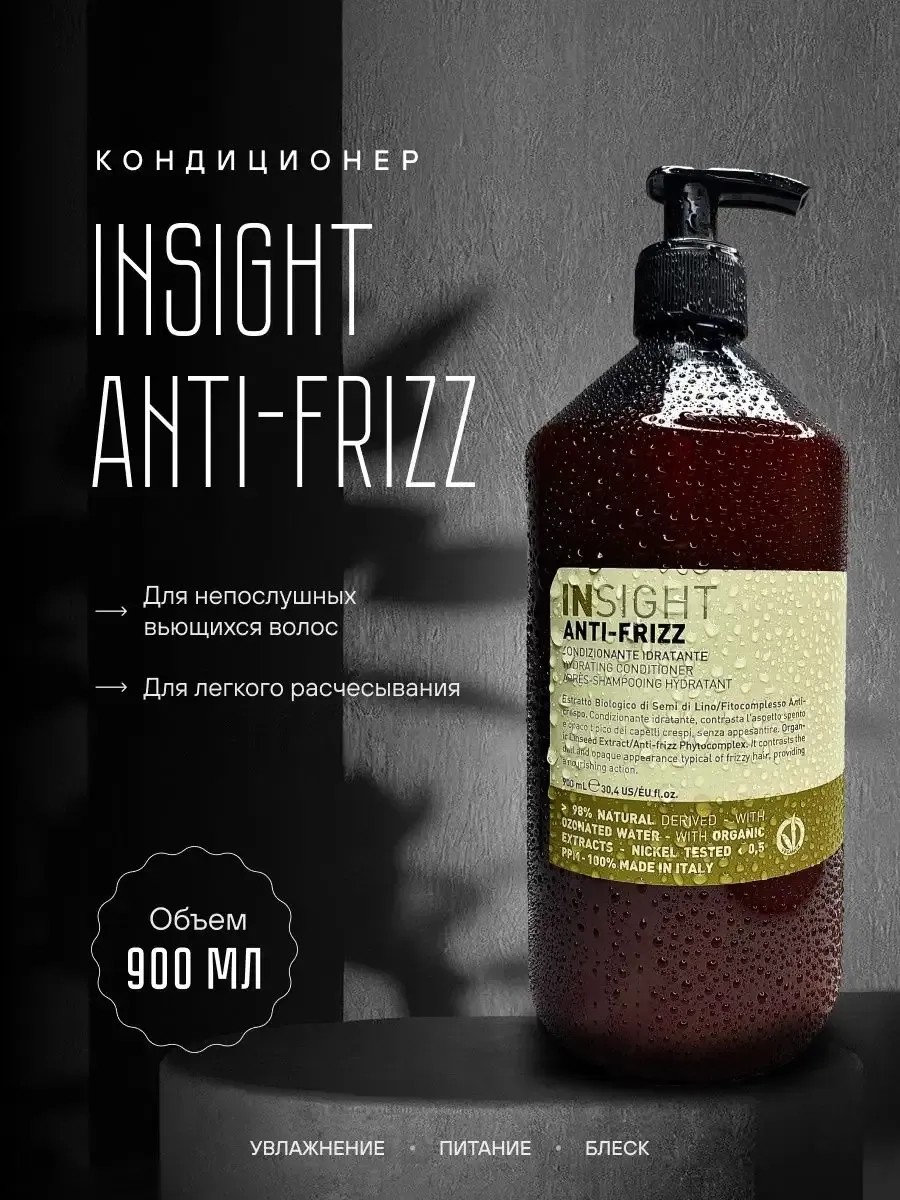 Увлажняющий кондиционер Insight anti-frizz содержит натуральные компоненты для интенсивного питания волос по всей длине без утяжеления. Благодаря бережному составу кондиционер для непослушных волос инсайд подходит для ежедневного применения. Регулярное использование профессионального итальянского кондиционера поможет сохранить здоровье и красоту волос на долгое время. Итальянский кондиционер Insight поддерживает естественный баланс влаги и увеличивает прочность волос, укрепляя их по всей длине.
