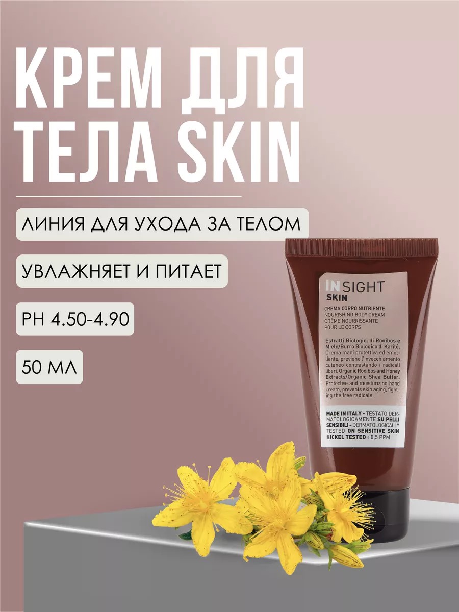 Skin Nourishing Профессиональная косметика: Крем питательный для ухода за кожей тела, Италия. 50 мл. Insight Skin Nourishing Body Cream - Крем питательный для тела - с богатой смесью активных ингредиентов и эмульгаторов природного происхождения делает этот крем идеальным продуктом для питания кожи и улучшает ее эластичность. Кожа становится более подтянутой и бархатистой. Крем для тела INSIGHT предназначен для глубокого увлажнения и питания кожи. Наносится после душа и дарит ощущение нежности на весь день. В составе продукта итальянской марки ИНСАЙТ более чем 98 процентов натуральных компонентов. Органическое масло каритэ питает, сохраняет влагу, делает кожу мягкой и гладкой. Экстракт ройбуша улучшает ее тонус. Экстракт зверобоя стимулирует защитные функции, предотвращает появление раздражений, успокаивает. INSIGHT Nourishing Body Cream протестирован дерматологами, которые подтвердили его безопасность даже для чувствительной и реактивной кожи. Не вызывает аллергии. Обладает ненавязчивым ароматом. Способ применения: Наносить на кожу тела, массажными движениями втирать до полного впитывания. Идеально на подарок маме, подруге, девушке, любимой и коллеге на день рождения, 8 марта, Новый год, День Святого Валентина. Рекомендуем использовать в комплексе с профессиональной серией уходовой косметики для волос Insight / Инсайт.