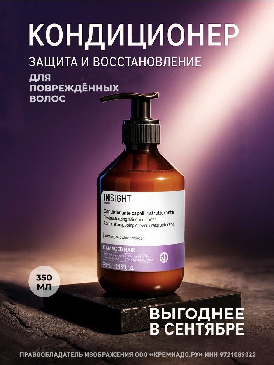 Кондиционер для сухих и поврежденных волос Инсайт. Специальная линия для интенсивного восстановления INSIGHT DAMAGED HAIR возвращает здоровье, блеск и силу ослабленным, поврежденным и подверженным стрессу волосам. Сильное химическое воздействие, окрашивание, сезонные изменения и перепады температур - всё это факторы, которые повреждают волосы и делают их ломкими, сухими, тусклыми и безжизненными. Деликатная формула восстанавливающего кондиционера обогащена витаминами и жирными кислотами, которые обволакивают волосы и защищают их. Экстракт пророщенных семян пшеницы, масла арганы и оливы питают и восстанавливают локоны, рисовые протеины добавляют силу и крепость. Благодаря органическим формулам, профессиональная косметика для волос INSIGHT безопасна и эффективна. Продукция экобренда из Италии не содержит силиконов, парабенов, искусственных красителей. В каждом стеклянном флаконе уходовой косметики вы найдете максимум натуральных ингредиентов, которые подарят вашей коже головы и волосам несравненный уход и мягкую защиту. Для тех, кто ценит профессиональный уход даже вдали от дома, компактный формат упаковки позволяет легко брать косметику для волос с собой в путешествия, провозить в ручной клади. Вы сможете с легкостью контролировать расход кондиционера благодаря прозрачно-янтарному стеклу флаконов, а удобная крышка обеспечит надежное закрытие, предотвращая проливание и загрязнение любимых продуктов. Идеально на подарок маме, подруге, любимой, коллеге на день рождения, 8 марта, Новый год, День Святого Валентина.