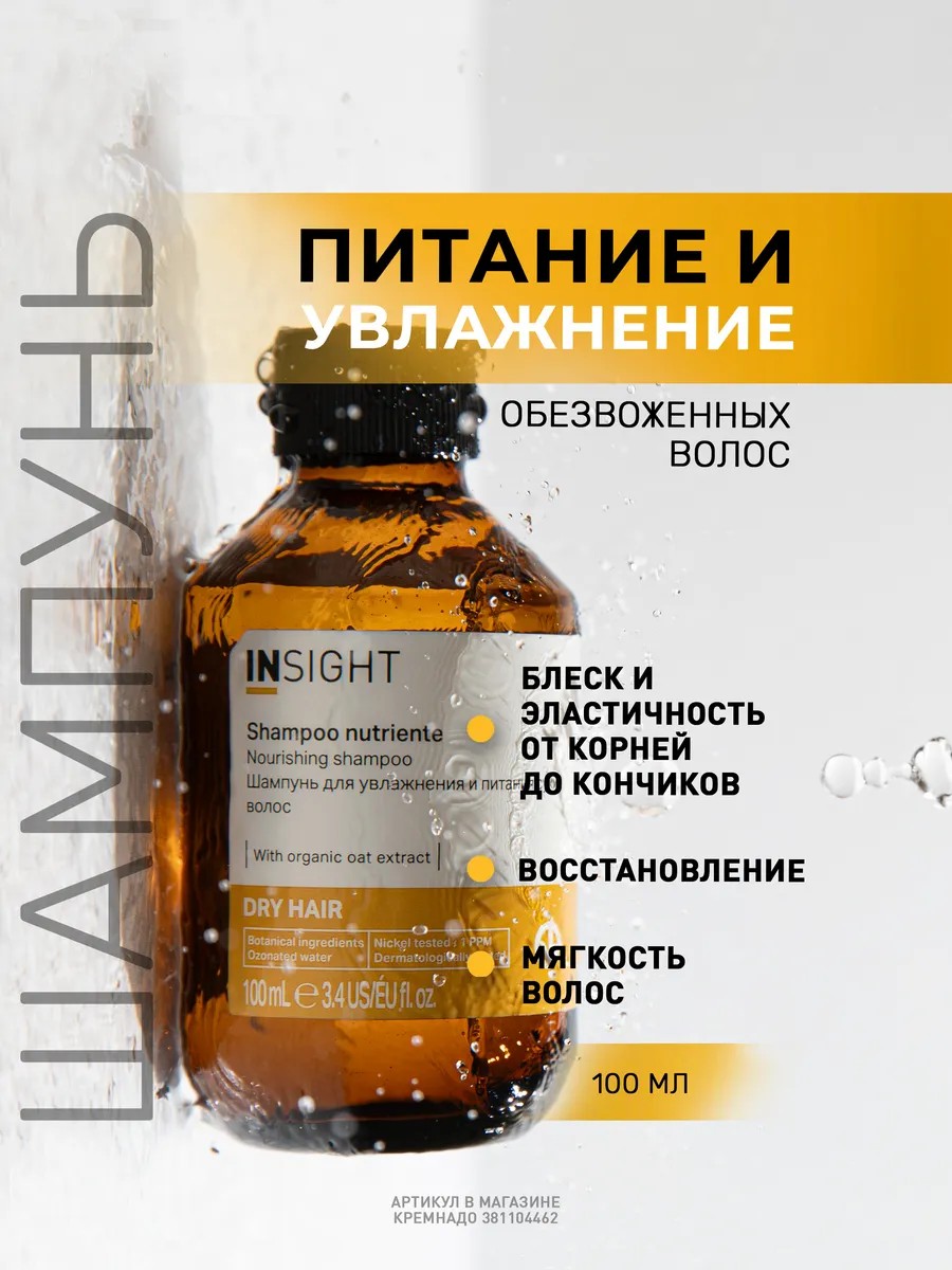 Инсайт Шампунь для сухих волос, 100 мл. Увлажняющая серия продуктов по уходу за сухими от природы волосами, пересушенными на солнце, после химических процедур окрашивания и химических завивок и выпрямлений. Особая смесь ингредиентов создана с целью максимально питать сухие тусклые волосы без утяжеления. Восстанавливающий уход укрепляет тонкие и ломкие волосы, придавая эластичность, объем и мягкость, проникая в капиллярный материал. Восстанавливающий уход укрепляет тонкие и ломкие волосы, придавая эластичность, объем и мягкость проникая в глубокие слои волоса. InsightDry Hair обладает питательными свойствами, гарантирует глубокое восстановление волос, укрепляет и улучшает их общее состояние. Деликатная формула, которая облегчает расчёсывание и придаёт сияние от корней до кончиков, делает волосы плотнее при этом не перегружая их. В составе серии: органический экстракт овса, кокосовое масло, масло эллипе, масло миндаля. Не содержит SLS/SLES, парабены, силиконы, минеральные масла, искусственные красители и ароматизаторы, линия гипоаллергенна. Используйте с другими продуктами: Insight кондиционер для волос и Insight маска для волос для увлажнения и питания сухих волос Insight DRY HAIR. Шампунь для увлажнения и питания сухих волос (рН 4.00-4.90) обладает питательными свойствами, гарантирует глубокое восстановление волокна волос, укрепляет их и улучшает общее состояние и здоровье волос. Волосы становятся мягкими, эластичными и блестящим от корней до кончиков. Наносить мягкими массирующими движениями на влажные волосы. Смыть тщательно водой. В случае необходимости повторить процедуру. Идеально на подарок маме, подруге, любимой, коллеге на день рождения, 8 марта