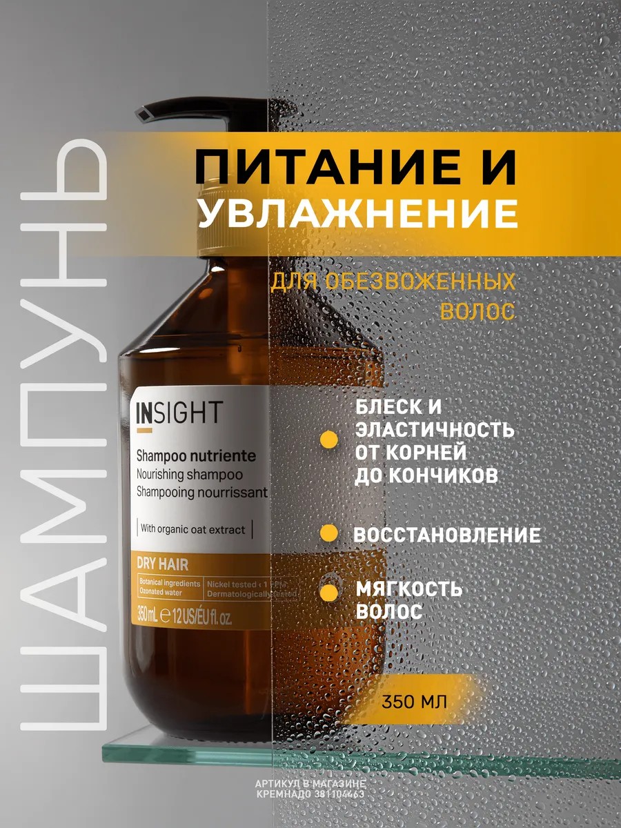 Инсайт Шампунь для сухих волос, 350 мл. в стеклянном флаконе. Увлажняющая серия продуктов по уходу за сухими от природы волосами, пересушенными на солнце, после химических процедур окрашивания и химических завивок и выпрямлений. Особая смесь ингредиентов создана с целью максимально питать сухие тусклые волосы без утяжеления. Восстанавливающий уход укрепляет тонкие и ломкие волосы, придавая эластичность, объем и мягкость, проникая в капиллярный материал. Серия Insight Dry Hair была создана с целью питания сухих, тусклых волос без утяжеления. Восстанавливающий уход укрепляет тонкие и ломкие волосы, придавая эластичность, объем и мягкость проникая в глубокие слои волоса. InsightDry Hair обладает питательными свойствами, гарантирует глубокое восстановление волос, укрепляет и улучшает их общее состояние. Деликатная формула, которая облегчает расчёсывание и придаёт сияние от корней до кончиков, делает волосы плотнее при этом не перегружая их. В составе серии: органический экстракт овса, кокосовое масло, масло эллипе, масло миндаля. Не содержит SLS/SLES, парабены, силиконы, минеральные масла, искусственные красители и ароматизаторы, линия гипоаллергенна. Используйте с другими продуктами: Insight кондиционер для волос и Insight маска для волос для увлажнения и питания сухих волос Insight DRY HAIR. Шампунь для увлажнения и питания сухих волос (рН 4.00-4.90) укрепляет и улучшает общее состояние и здоровье волос. Волосы становятся мягкими, эластичными и блестящим от корней до кончиков. Наносить мягкими массирующими движениями на влажные волосы. Смыть тщательно водой. В случае необходимости повторить процедуру. Для тех, кто ценит профессиональный уход даже вдали от дома, компактный формат упаковки позволяет легко брать косметику для волос с собой в путешествия, провозить в ручной клади. Идеально на подарок маме, подруге, любимой, коллеге на день рождения, 8 марта
