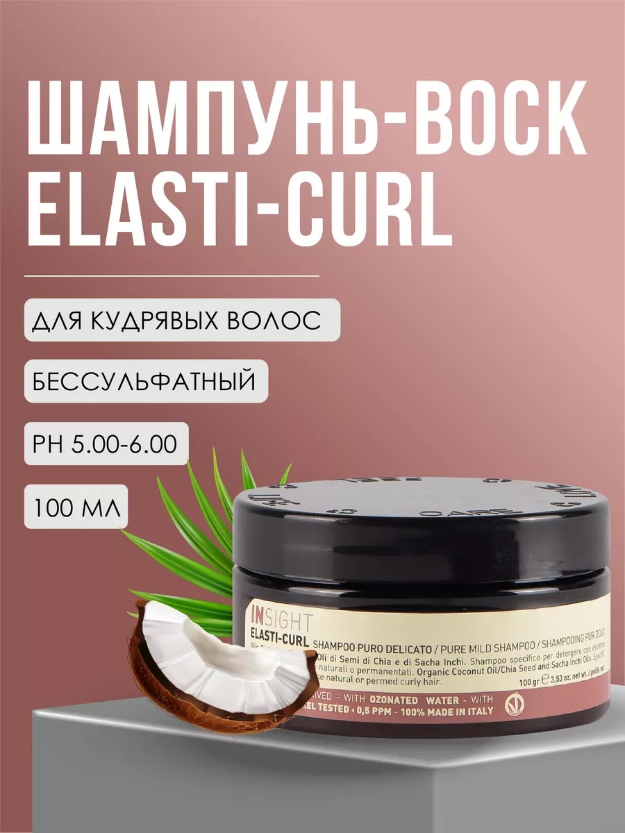 Elasti-Curl Профессиональный увлажняющий шампунь - воск: уход за кудрявыми волосами, Италия. 100мл. Особо деликатный Insight шампунь для волос для тщательного очищения кудрявых, вьющихся или завитых волос. Его увлажняющая формула делает волосы мягкими, увеличивая их объем и блеск без вреда для текстуры. Кокосовое масло является одним из самых популярных натуральных масел в уходе за волосами, особенно для волос, которые нуждаются в дополнительном увлажнении. Кокос богат насыщенными жирами, пособ применения: Нанести необходимо количество твердого шампуня на ладони, добавить немного воды, вспенить, затем нанести на влажную кожу головы и волосы массирующими движениями. Тщательно смыть водой. Идеально на подарок маме, подруге, девушке, любимой и коллеге на день рождения, 8 марта, Новый год, День Святого Валентина. Рекомендуем использовать в комплексе с профессиональной серией уходовой косметики для ухода за волосами Insight / Инсайт.