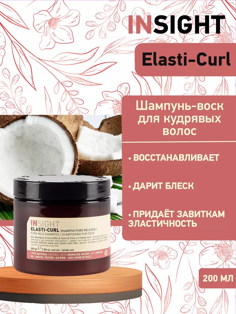 Insight Elasti-Curl Pure Mild Shampoo (76087939) is an especially gentle shampoo-wax for thoroughly cleansing curly, wavy, or permed hair. Its moisturizing formula leaves hair soft, adding volume and shine without stripping texture. Active ingredients: organic coconut oil, chia seeds, and sacha inchi oil. Directions: Apply the desired amount of solid shampoo to your palms, add a little water, lather, and then apply to damp scalp and hair using massaging movements. Rinse thoroughly with water. Volume: 200 ml.