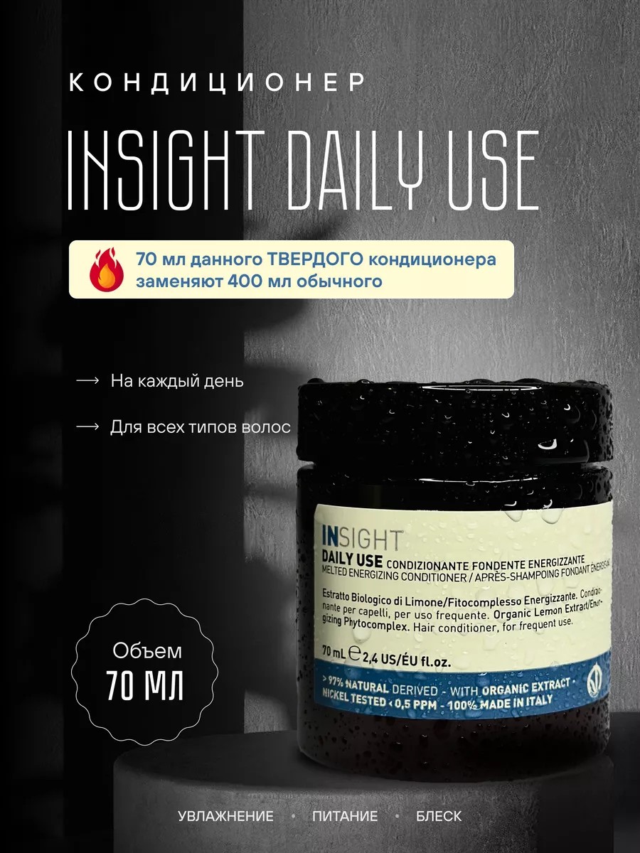 Профессиональный итальянский кондиционер Insight Daily Use создан для питания пушистых, ломких и непослушных волос. Увлажняющий кондиционер Insight Daily Use содержит натуральные компоненты для интенсивного питания волос по всей длине. Благодаря бережному составу кондиционер для волос инсайд подходит для ежедневного применения. Регулярное использование профессионального итальянского кондиционера поможет сохранить здоровье и красоту волос на долгое время. Питательный кондиционер инсайд подходит для любого типа волос, включая окрашеные. Итальянский кондиционер Insight поддерживает естественный баланс влаги и увеличивает прочность волос. Профессиональный кондиционер для волос минимализирует риски выпадения волос, предотвращает сечение кончиков и придает волосам здоровый блеск и сияние. В нашем магазине вы можете приобрести весь набор профессиональной косметики инсайд (шампуни, бальзамы, маски и кондиционеры).