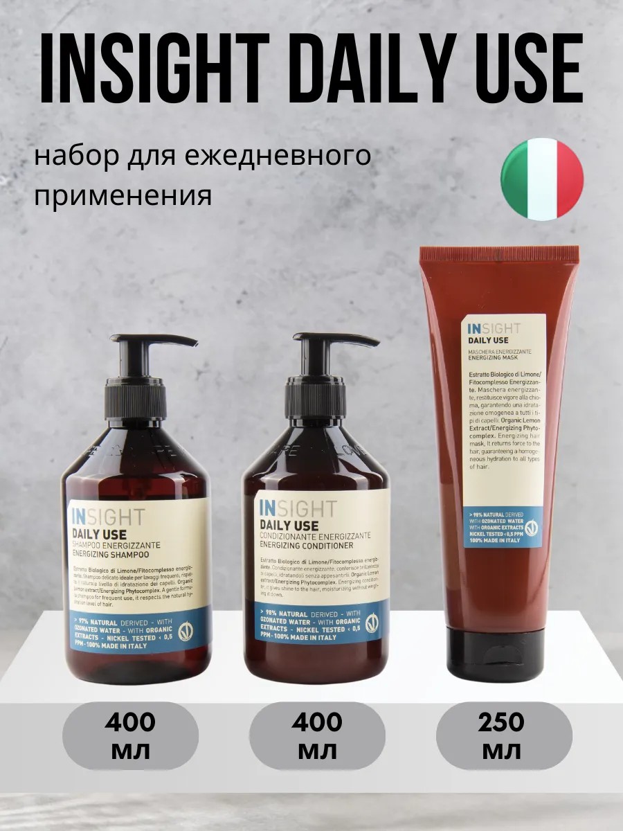 The Insight PROFESSIONAL Daily Use gift set (400 ml) includes a premium Italian shampoo, conditioner, and 250 ml mask for daily use. Provides thorough cleansing, nourishment, and hydration. This product restores hair, leaving it silky, supple, and shiny. Suitable for regular use thanks to its neutral pH (4.50–4.90). This shampoo restores natural energy, maintains moisture balance, and prevents damage. Free from harmful ingredients such as SLS and SLES, it guarantees a gentle treatment even for weakened hair. Directions: Apply a small amount to wet hair, distribute through the lengths, and lather with gentle movements. Rinse with warm water. An ideal gift for loved ones—mom, sister, or friend—for any occasion: a celebration, a birthday, or simply as a token of your care. With Insight, your hair will become strong, smooth, and shiny! Browse our selection and choose the best hair care products for different hair types.