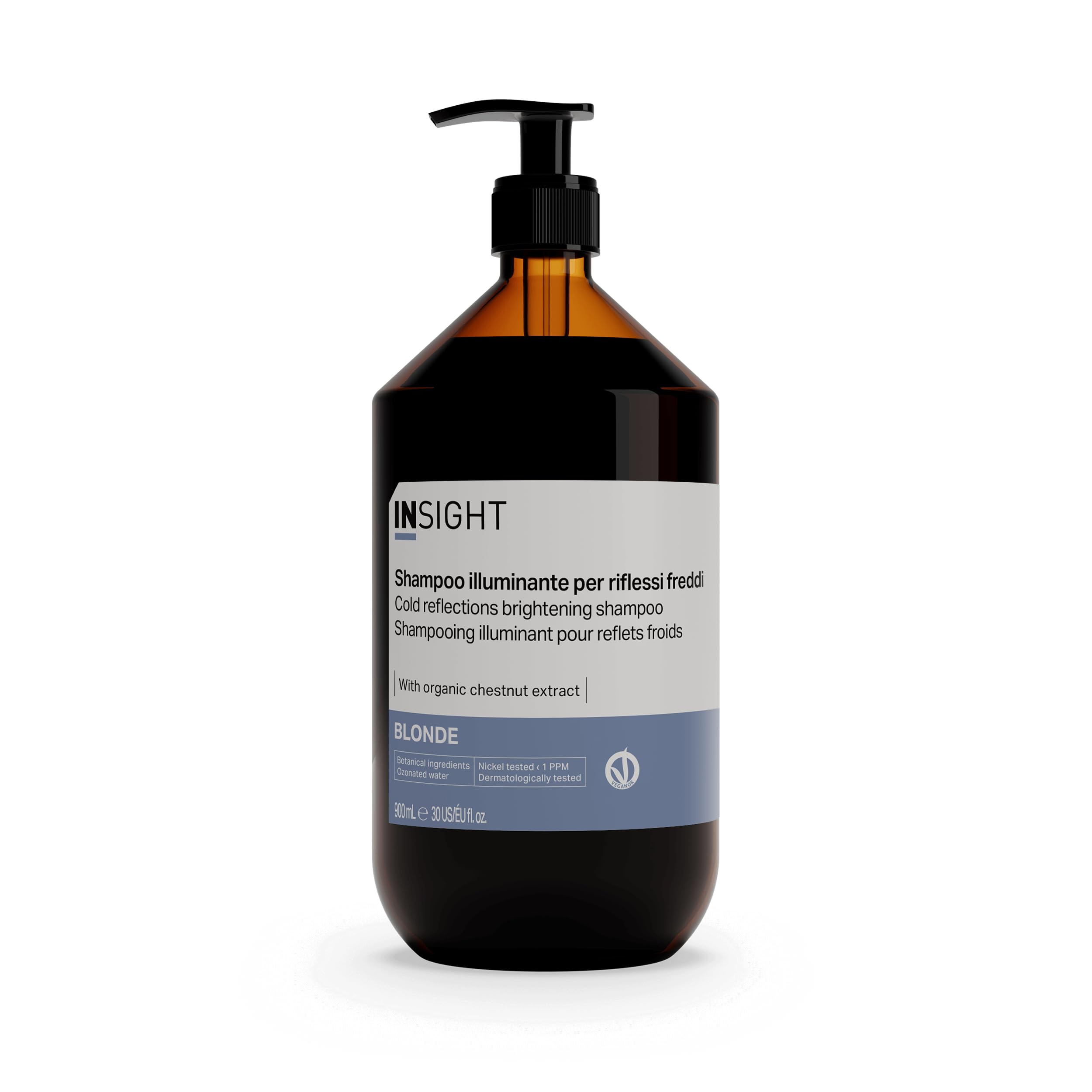 Take complete control of your blonde hair with this illuminating shampoo for cool tones. Whether natural or color-treated, this shampoo gently cleanses while neutralizing the yellow-orange tones that plague those with blonde hair. Its formula, enriched with organic chestnut extract, moisturizes and increases hair elasticity, leaving it soft, luminous, and flawless. INGREDIENTS Aqua Water Eau, Sodium Coceth Sulfate, Cocamidopropyl Betaine, Magnesium Lauryl Sulfate, Coco-Glucoside, Glyceryl Oleate, Guar Hydroxypropyltrimonium Chloride, Parfum Fragrance, Hydrolyzed Chestnut Extract, Avoine Sativa (Oat) Leaf Stalk Extract, Chamomilla Reel Cutita (Matricaria) Flower Extract, Citric Acid, Tocopherol, Hydrogenated Palm Glycerides Citrates, Acid Violet 43 Ext. Violet 2, Sodium Chloride, Sodium Benzoate, Potassium Sorbate, Benzyl Alcohol, Dehydroacetic Acid. DIRECTIONS FOR USE Apply to wet hair, massage to form a lather, rinse thoroughly. SAFETY WARNING No See moreNeutralizes the yellow-orange tones that afflict those with blond hair.Insight Shampooing Blonde illuminant pour les reflets froids 900 ml spécialement dédié au maintien de la couleur dans les cheveux blancs, gris ou blonds emballage en verreDESCRIPTION DU PRODUIT DESCRIPTION DU PRODUIT Prenez le contrôle total de vos cheveux blonds avec le shampooing illuminant pour reflets froids. Qu'ils soient naturels ou colorés, ce shampooing, tout en nettoyant en douceur, neutralise les reflets jaune-orange qui affligent ceux qui ont les cheveux blonds. Sa formule, enrichie en extrait biologique de châtaigne, hydrate et augmente l'élasticité des cheveux, les laissant doux, lumineux et impeccable. INGRÉDIENTS Aqua Water Eau, Sodium Coceth Sulfate, Cocamidopropyl Betaine, Magnesium Lauryl Sulfate, Coco-Glucoside, Glyceryl Oleate, Guar Hydroxypropyltrimonium Chloride, Parfum Fragrance, Hydrolyzed Chestnut Extract, Avoine Sativa (Oat) Leaf Stalk Extract, Chamomilla Reel Cutita (Matricaria) Flower Extract, Citric Acid, Tocopherol, Hydrogenated Palm Glycerides Citrates, Acid Violet 43 Ext. Violet 2, Sodium Chloride, Sodium Benzoate, Potassium Sorbate, Benzyl Alcohol, Déhydroacétic Acid. MODE D'EMPLOI Appliquer sur les cheveux mouillés, masser pour former une mousse, rincer abondamment. AVERTISSEMENT DE SÉCURITÉ Non Voir plusNeutralise les reflets jaune-orange qui affligent ceux qui ont les cheveux blonds.