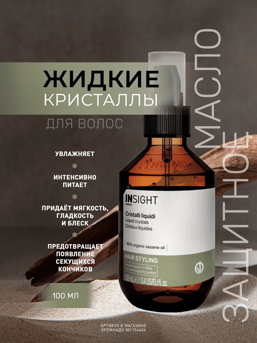 Термозащита для волос - это жидкие кристаллы Insight в составе масла для ухода за волосами. Масло для волос несмываемое INSIGHT оберегает пряди от воздействия горячих температур во время использовании фена, утюжка или плойки, питает и восстанавливает структуру. Масло INSIGHT STYLING в стеклянном флаконе с дозатором отлично подходит для кончиков волос. Основные компоненты в составе жидких кристаллов: масло семян кунжута и семян льна. Кунжутное масло богато антиоксидантами, полиненасыщенными кислотами и витаминами. Оно смягчает, сохраняет эластичность волос, защищает от сечения, придает блеск. Льняное масло в составе жидких кристаллов от Insight Professional - увлажняет, разглаживает, облегчает расчесывание, блокирует воздействие ультафиолета. Styling Liquid Crystal от INSIGHT не пачкают волосы и не утяжеляют их. Средство обеспечивает антистатический эффект. Локоны после применения не пушатся и меньше электризуются. Способ применения: на влажные волосы. Нанести 2-3 капли на ладони, затем распределить продукт по длине волос. Дать впитаться. Попробуйте вместе: Insight Восстанавливающий комплекс для волос HAIR REPAIR COMPLEX