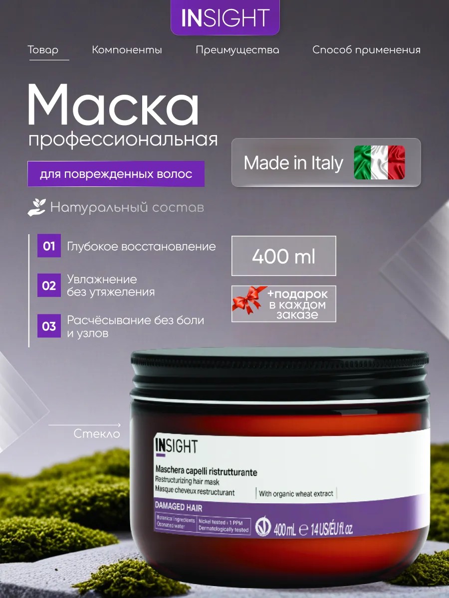 Та самая разглаживающая маска для поврежденных волос INSIGHT DAMAGED HAIR 500 мл - незаменимый продукт для тех, кто желает вернуть здоровье своим волосам. Благодаря уникальной формуле, маска эффективно питает и укрепляет волосы, восстанавливая их структуру и придавая им здоровый блеск. Средство обладает высокой концентрацией активных компонентов, которые глубоко проникают в волосы, устраняя сухость, ломкость и сечение. Маска для поврежденных волос подходит для всех типов волос и обеспечивает надежную защиту от внешних воздействий, таких как солнечные лучи, морская вода и хлорированная вода в бассейне. Регулярное использование маски поможет вашим волосам выглядеть здоровыми, ухоженными и красивыми. Бальзам помогает предотвратить ломкость, секущиеся кончики, последствия после кератинового выпрямления, ламинирования и другие повреждения волос, обеспечивая их защиту от негативного воздействия окружающей среды.