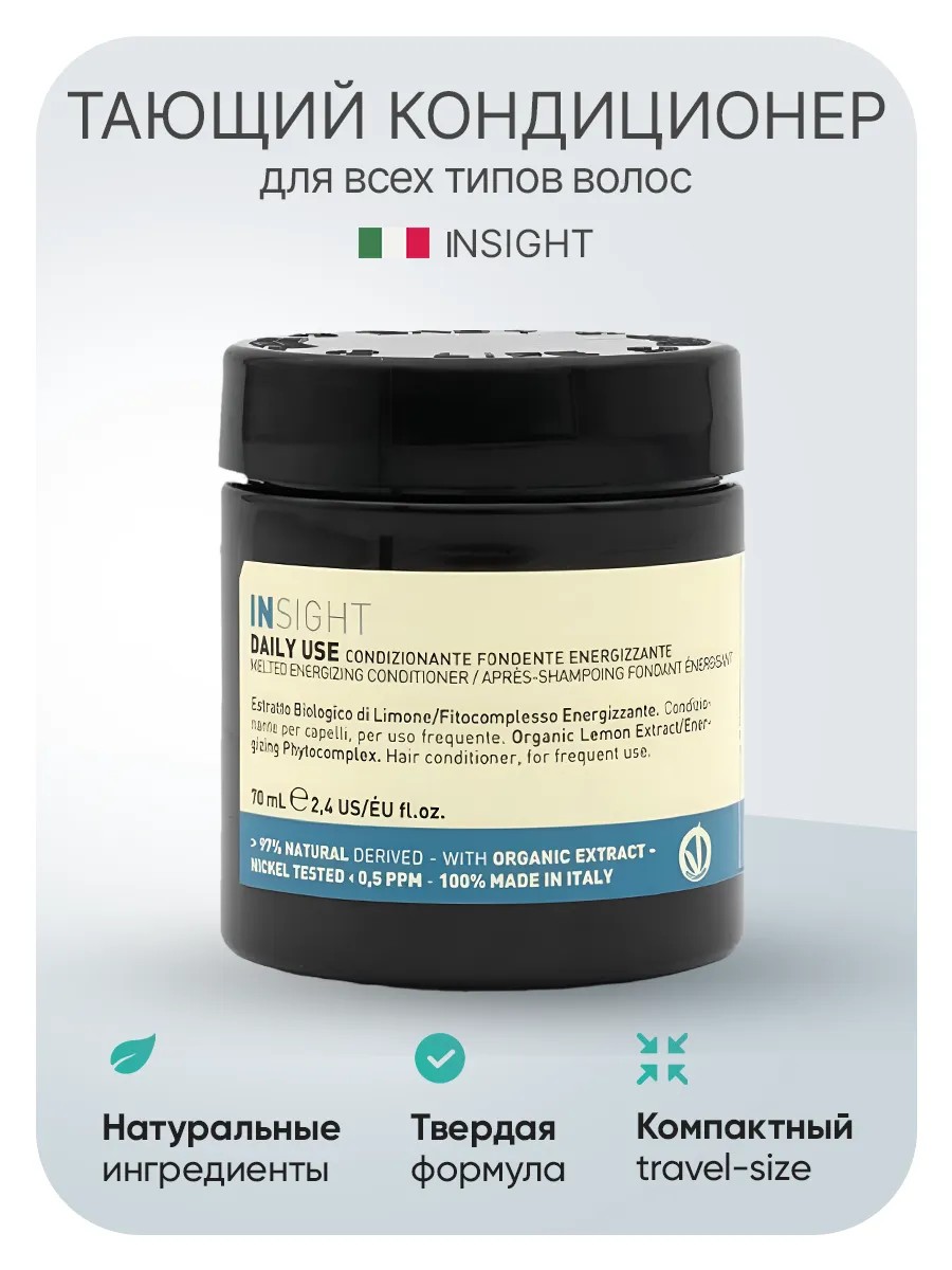 Средства для ежедневного ухода за волосами должны обладать укрепляющими свойствами и иметь питательные и увлажняющие компоненты. Итальянский бренд профессиональной косметики INSIGHT предлагает инновационный продукт в линии DAILY USE для всех типов волос. Твердый энергетический кондиционер с тающей текстурой и низким содержанием воды глубоко увлажняет и смягчает изнутри. Тонизирующее средство возвращает упругость и эластичность ломких и слабых волос. Бессульфатный эко - бальзам оказывает восстанавливающее действие на испорченные волосы, в т. ч. тонированные и мелированные. Кондиционер подчеркивает насыщенность цвета у темных и холодный оттенок у светлых окрашенных волос. Веганский кондиционер содержит экологически чистые компоненты, чтобы напитать тусклые и истонченные волосы без утяжеления. Фито – масла и аминокислоты натурального происхождения оказывают реконструирующий уход и кондиционирующее действие для укрепления поврежденных волос. Фитокомплекс оказывает регенерирующий эффект и снижает повышенную жирность. Органический экстракт лимона оказывает антисептическое действие и укрепляет слабые волосы. Лимонный сок придает блеск и естественное сияние. Абрикосовое масло помогает смягчает структуру жестких и седых волос. Экстракт абрикоса предотвращает ломкость и появление секущихся кончиков и делает пряди гладкими и эластичными. Масло подсолнечника оказывает регенерирующий эффект и запечатывает кутикулу волоса. Также удаляет налет с волос и помогает избежать пересушивания. Масло зародышей пшеницы является природным антиоксидантом и делает волосы послушными при расчесывании и укладке. Органический кондиционер разглаживает и выравнивает волосы по всей длине. Концентрированная формула делает бальзам - ополаскиватель более экономичным, чем аналогичный продукт в жидкой форме. Можно использовать для всей семьи: как мужской, женский или подростковый уход. Для домашнего и профессионального использования. Компактный трэвэл - формат идеален для путешествий и авиаперелетов.