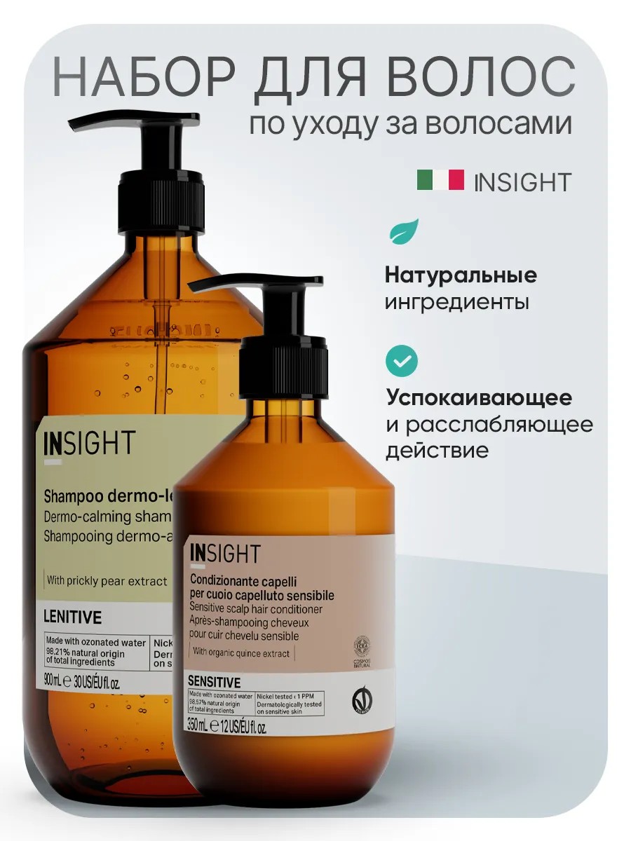 Такие проблемы кожи головы как зуд и шелушение приносят много неудобств обладателям темных и светлых окрашенных волос. А любые проявления экземы и псориаза требуют еще и особого ухода за чувствительной кожей головы. Волосы становятся тусклыми и ломкими. Далее последуют потеря волос или облысение. Итальянский бренд профессиональной косметики INSIGHT предлагает смягчающий шампунь линии LENITIVE, который может использоваться как на начальном этапе проявления проблемы для деликатного очищения и успокоения раздраженной кожи головы, так и во время обострения с расчесами и микротравмами. Натуральный очищающий продукт не вызывает раздражение и сухость. Бессульфатный эко - шампунь оказывает увлажняющее и успокаивающее действие и имеет в составе целый комплекс натуральных целебных ингредиентов. Экстракт индийского риса и инжирной опунции имеют увлажняющие и регенеративные свойства. Экстракт мальвы смягчает и успокаивает. Органический экстракт алоэ интенсивно питает и нормализует выработку себума. Успокаивающий шампунь имеет противовоспалительные свойства, придает блеск и мягкость. Мягкий кондиционер SENSITIVE не только глубоко увлажняет, но и смягчает волосы изнутри. Веганский бальзам не вызывают аллергических реакций. Органический экстракт тыквы делает волосы более эластичными и имеет успокаивающие свойства, тонизирует и стимулирует регенерацию клеток. Экстракт айвы оказывает противовоспалительное и антиоксидантное действие, а также напитывает поврежденные участки. Набор активных веществ в составе бальзама делает волосы более здоровыми и послушными. Средство борется с жирностью волос и оптимизирует гидролипидный баланс кожи головы. Бальзам разглаживает и облегчает расчесывание. Кондиционер обладает антиоксидантным действием. Волосы выглядят сильными, здоровыми и напитанными. Бальзам не провоцирует появление перхоти и подходит для ежедневного использования. Подходит для всей семьи: как мужской, женский или подростковый уход. Для домашнего и профессионального использования.