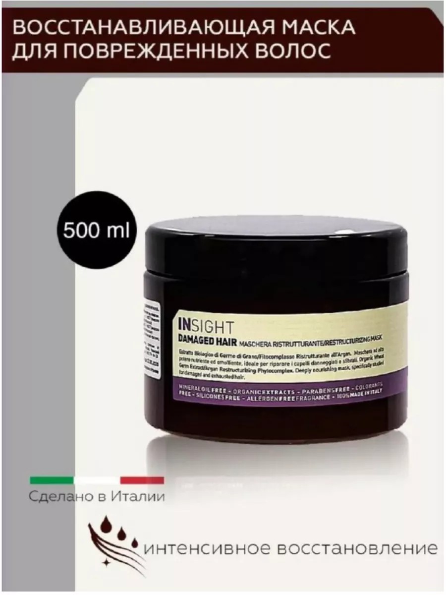 Восстанавливающая реструктурирующая маска для волос объемом 500 мл Damaged Hair Restructurizing итальянского бренда Insight глубоко питает и восстанавливает волосы, подходит для ухода за поврежденными и ломкими волосами. Благодаря инновационной формуле, богатой жирными кислотами и витаминами, профессиональная маска проникает в стержень волоса и гарантирует его глубокое восстановление и укрепление. Экстракт пророщенных семян пшеницы, масла арганы и оливы питают и восстанавливают волосы. Рисовые протеины добавляют силу и крепость по всей длине.