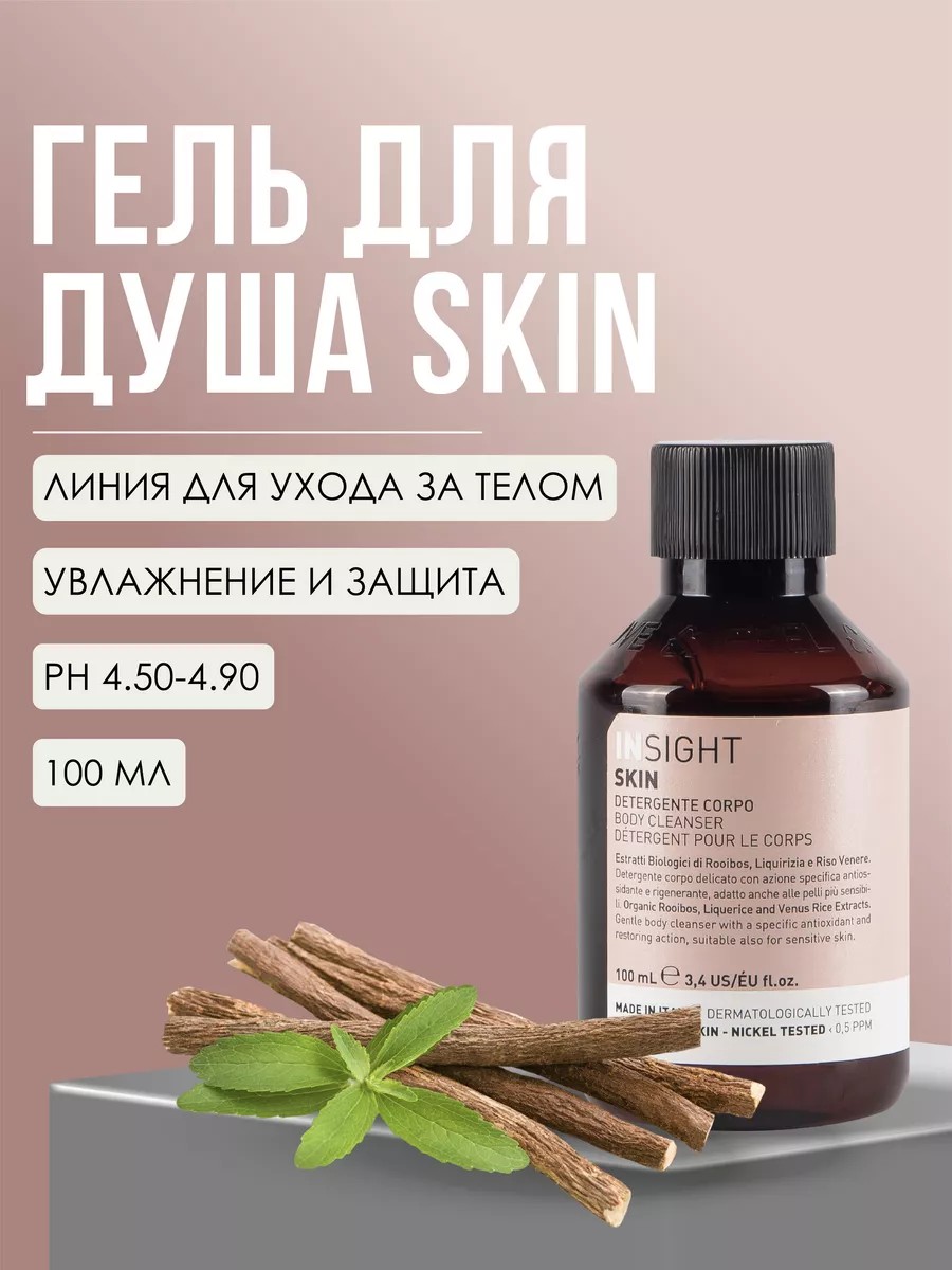Skin Body Cleanser Professional body cleansing gel, Italy. 100 ml. Gently cleanses the skin, maintaining its natural water-oil balance. Moisturizes, protects against free radicals. Has a soothing effect. Intended for daily use. Apply to damp skin with massage movements. Rinse thoroughly with water. Does not leave a soapy residue, does not dry the skin, and maintains its optimal moisture level. This product from the Italian professional cosmetics brand INSIGHT has an organic composition. Rice extract preserves youthful skin, smoothes wrinkles, eliminates pigmentation, and evens out the tone. Rooibos and licorice extracts moisturize and soften, protecting against inflammation. INSIGHT Body Cleanser does not contain components that clog pores or cause irritation. Suitable even for sensitive or problematic skin. Directions: Apply the desired amount to damp skin and hair, massage in, and rinse with plenty of water. Ideal as a gift for mom, friend, girlfriend, partner, or colleague for birthdays, March 8th, New Year's, or Valentine's Day. We recommend using it in combination with the Insight professional hair care line.
