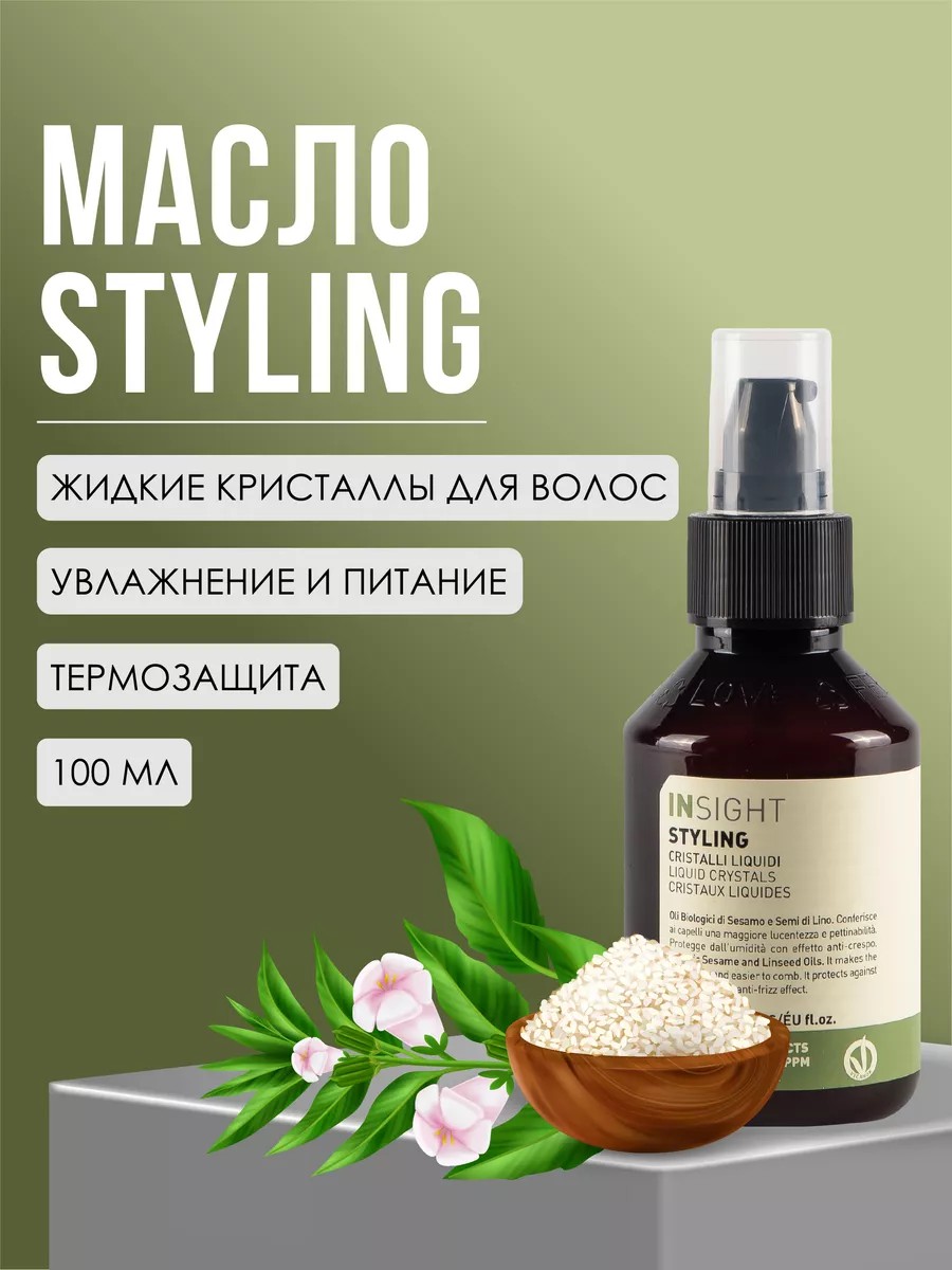 Styling Liquid Crystal Professional Cosmetics: Protective Hair Oil Liquid Crystals, 100 ml. Insight Styling Liquid Crystals is a multifunctional product for effectively restoring damaged hair structure based on two oils: flaxseed and sesame. Provides deep hydration and intense nourishment, leaving hair soft, smooth, and shiny. Prevents split ends. Effectively blocks the negative effects of UV rays and acts as a protective barrier against thermal exposure. Does not leave hair feeling greasy, weighs it down, or makes it sticky. It has an antistatic effect, protects, and reduces hair's susceptibility to external negative factors. INSIGHT Liquid Crystals is a hair care product with thermal protection. Protects strands from the effects of hot temperatures when using a hair dryer, straightening iron, or curling iron, nourishes and restores structure. The main ingredients in INSIGHT liquid crystals are sesame seed oil and flaxseed oil. Sesame oil is rich in antioxidants, polyunsaturated acids, and vitamins. It softens hair, maintains its elasticity, protects against split ends, and adds shine. Flaxseed oil moisturizes, smoothes, makes combing easier, and blocks UV rays. INSIGHT Styling Liquid Crystals won't stain or weigh hair down. The product has an antistatic effect. Curls are frizz-free and less prone to static after use. Directions: Apply 2-3 drops to your palms. Apply to washed and dried hair. Distribute evenly over the entire length. Do not rinse! Allow the product to absorb before drying. Styling should begin after 5-10 minutes. Can be used on dry hair. An ideal gift for mom, friend, girlfriend, partner, or colleague for birthdays, March 8th, New Year's, or Valentine's Day. We recommend using it in combination with the Insight professional hair care line.