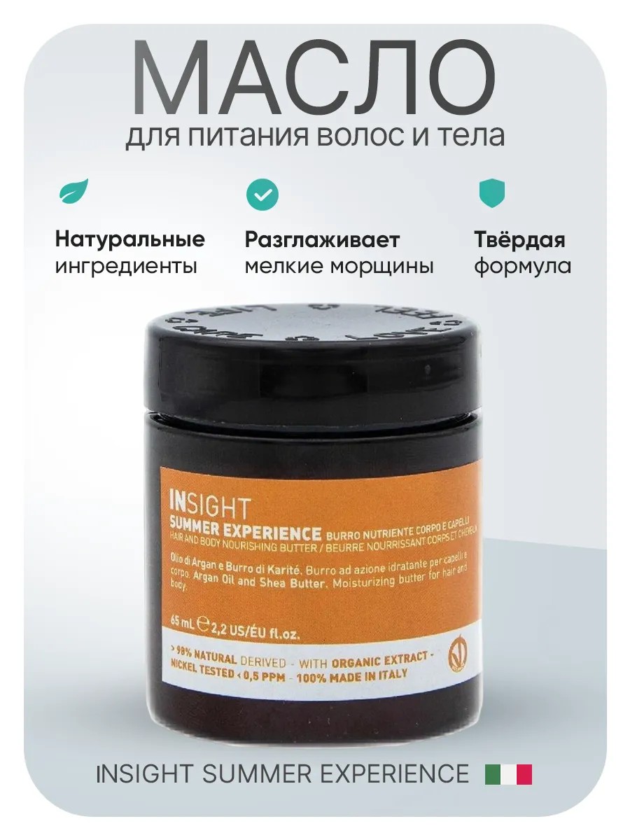 Итальянский бренд профессиональной косметики INSIGHT разработал универсальное обволакивающее средство 2 в 1 для смягчения и увлажнения волос и тела после пребывания на солнце и в соленой морской воде. Твердое масло с тающей текстурой эффективно ухаживает и создает естественное летнее сияние на коже и локонах. Органические масло ши и аргановое масло насыщают витаминами и ускоряют процесс регенерации. Питательное масло – обязательный продукт для кожи после пребывания под УФ – излучением. Восстанавливающий продукт обладает anti - age эффектом, предотвращает фотостарение и оказывает омолаживающее воздействие. Осветляющее масло разглаживает мелкие морщины и укрепляет тугор кожи. Прессованное средство способствует выработке коллагена и эластина и ускоряет обновление клеток. Косметическое средство убирает покраснения и шелушения и выравнивает тон кожи. Глубоко увлажняет и интенсивно питает. Не забивает поры и не оставляет жирный блеск и липкость. Природное масло оказывает мощное противовоспалительное действие и подходит для жирной и проблемной кожи, склонной к угревой сыпи и появлению прыщей. Укрепляющее средство для поврежденных и сухих волос возвращает прядям блеск, сияние и мягкость. Делает волосы послушными и облегчает расчесывание. Восстанавливающее масло запечатывает влагу и волокнах волос и возвращает эластичность и упругость. Органический продукт помогает справиться с сухостью окрашенных и мелированных волос. Масло - антиоксидант выполняет защитную функцию и препятствует электризации. Увлажняющее средство улучшает общее состояние волос, делая их более здоровыми и сильными. Масло разглаживает и выравнивает волосы, придавая шесковистость. Локоны становятся упругими и гладкими.