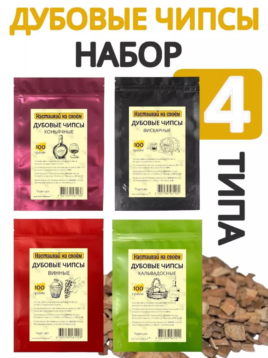 | Комплектация | Дубовые чипсы вискарные 100 гр; Дубовые чипсы кальвадосные 100 гр; Дубовые чипсы коньячные 100 гр; Дубовые чипсы винные 100 гр |