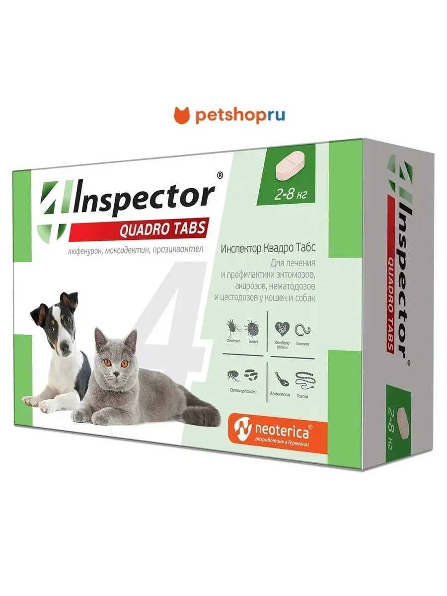 Inspector Quadro – один от всех! Комплексные таблетки для кошек и для собак против 20 видов наружных и внутренних паразитов.