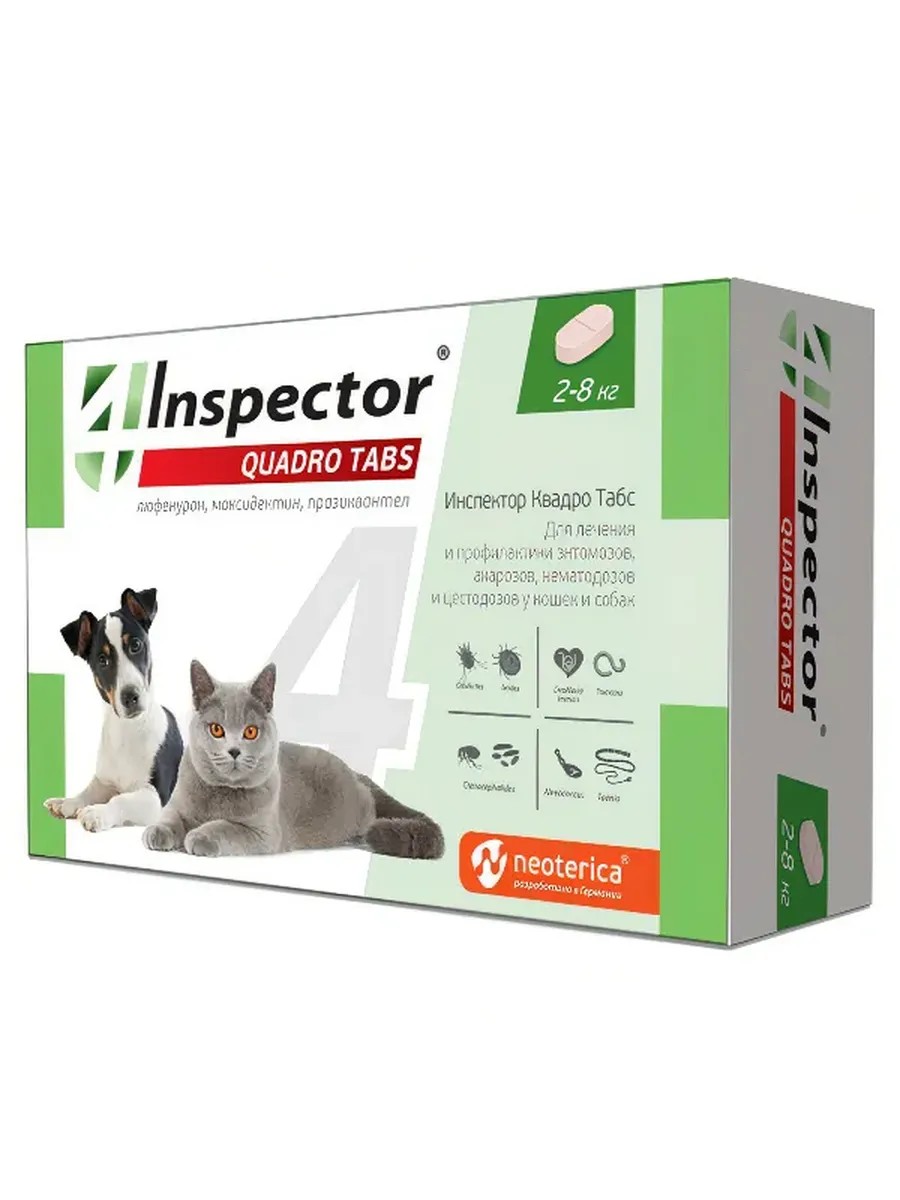 Инспектор QUADRO TABS - это эффективный препарат для защиты собак и кошек от широкого спектра паразитов. Таблетки QUADRO TABS предназначены для лечения и профилактики энтомозов, демодекоза, отодектоза, саркоптоза, нотоэдроза, акарозов, цестодозов, а также профилактики дирофиляриоза. Инспектор QUADRO TABS эффективно борется с блохами, клещами и глистами, защищая вашего питомца от 20 видов внешних и внутренних паразитов. Препарат содержит люфенурон, моксидектин и празиквантел, которые обеспечивают комплексное действие против паразитов. Инспектор QUADRO TABS подходит для собак и кошек, включая щенков и котят весом от 0,5 до 2 кг. Удобная форма таблеток облегчает прием препарата. Для достижения максимального эффекта рекомендуется проконсультироваться с ветеринаром.
