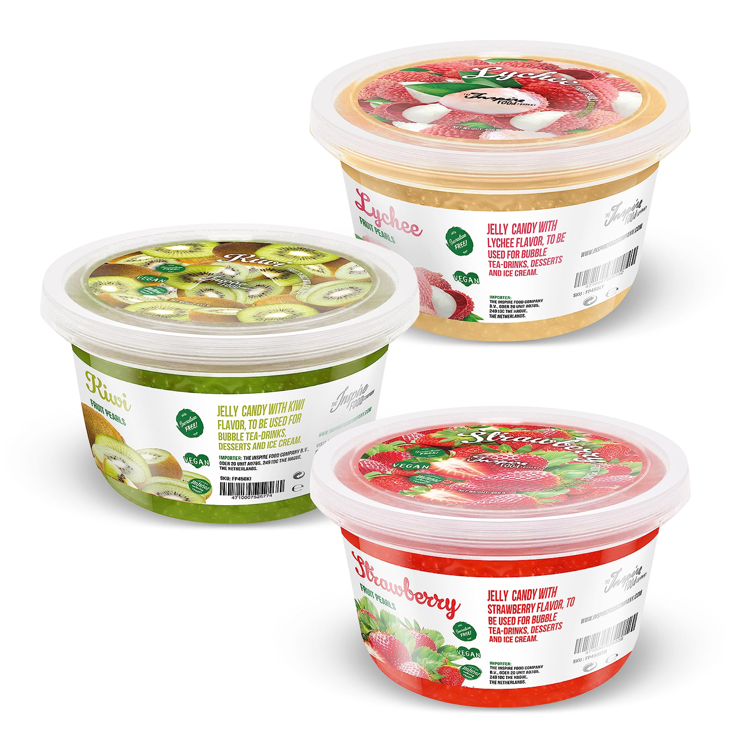 ✓ 100 % vegan and gluten -free - worried because they eat vegan or gluten -free?No reason to worry, our popping Boba is gluten -free and not made of gelatin, but from natural sea grase extract.✓ No artificial dyes - here at Inspire Food Company we particularly make sure that we only select high -quality ingredients for our products, so we avoid artificial ingredients as far as possible.There are therefore no artificial dyes, only ingredients such as carotene, anthazyan or vegetable carbon.✓ Prepare something really great - have you always wanted to prepare something outstanding for your friends and family?Popping Boba is not only suitable for the production of bubble tea, but is also great for cocktails, sparkling wines (e.g. Prosecco), ice cream, yogurt or all types of dessert!Why don't you try on whipped cream?.✓ Easy to apply - our bobas are packed in an easy -to -open container, and the popping boba itself does not have to be prepared or cooked, but can be enjoyed directly!.✓ The original Popping Boba - here at The Inspire Food Company we only serve the original Popping Boba from Taiwan.Because only the original popping boba ensures the perfect feeling followed by the fluid of the fruity juice!.✓ 100 % VEGAN und GLUTENFREI - Besorgt, weil Sie sich vegan oder glutenfrei ernähren? Kein Grund zur Sorge, unser Popping Boba ist glutenfrei und nicht aus Gelatine hergestellt, sondern aus natürlichem Seegrasextrakt. ✓ KEINE KÜNSTLICHEN FARBSTOFFE - Hier bei Inspire Food Company achten wir besonders darauf, nur qualitativ hochwertige Inhaltsstoffe für unsere Produkte auszuwählen, daher vermeiden wir künstliche Inhaltsstoffe so weit wie möglich. Es gibt daher keine künstlichen Farbstoffe, nur Inhaltsstoffe wie Carotin, Anthozyan oder pflanzlichen Kohlenstoff. ✓ BEREITEN SIE ETWAS WIRKLICH TOLLES ZU - Sie wollten schon immer etwas Herausragendes für Ihre Freunde und Familie zubereiten? Popping Boba ist nicht nur zur Herstellung von Bubble Tea geeignet, sondern ist auch toll für Cocktails, Schaumweine (z. B. Prosecco), Eis, Joghurt oder alle Arten von Dessert geeignet! Warum probieren Sie ihn nicht auch einmal auf Schlagsahne aus?. ✓ EINFACH ANZUWENDEN - Unsere Bobas sind in einem einfach zu öffnenden Behälter verpackt, und der Popping Boba an sich muss nicht vorbereitet oder gekocht werden, sondern kann direkt genossen werden!. ✓ DER ORIGINALE POPPING BOBA - Hier bei The Inspire Food Company servieren wir ausschließlich den originalen Popping Boba aus Taiwan. Denn nur der originale Popping Boba sorgt für das perfekte Gefühl gefolgt vom Herausfließen des fruchtigen Saftes!.INSPIRE FOOD Bubble Tea Perlen Set - 3er-Pack Popping Boba Fruchtperlen | Erdbeer, Kiwi, Litschi |Tapioka Perlen 100% vegan und glutenfrei, ohne künstliche Farbstoff, je 450g Erdbeere, Kiwi, Litschi 3 x 450 Gramm