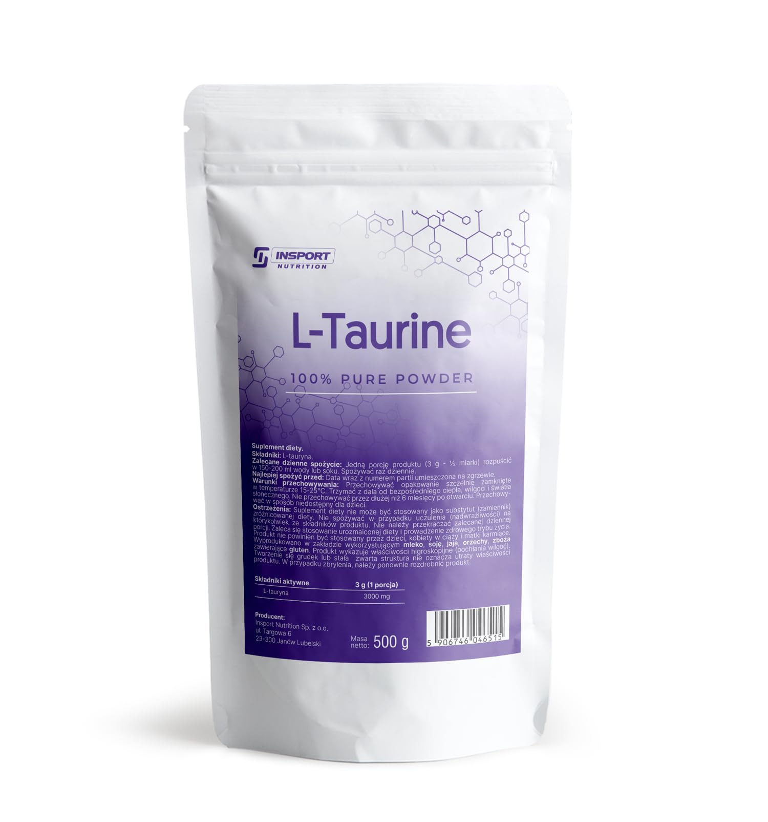 L-TAURINE is a high-quality food supplement from Insport Nutrition, providing pure taurine in powder form. Taurine is a non-protein amino acid that occurs naturally in the human body and is involved in many important physiological processes. It is particularly important for physically active individuals, athletes, and those seeking to improve their overall health. L-Taurine - 3000 mg Best before: Date with batch number on the seal. Storage conditions: Keep the tightly closed container between 15 and 25 C. Keep away from direct heat, moisture, and sunlight. Do not store for more than 6 months after opening. Keep out of reach of children. Warning: This food supplement should not be used as a substitute for a varied diet. Do not consume if you are allergic (hypersensitive) to any of the ingredients in this product. Do not exceed the recommended daily dose. A varied diet and a healthy lifestyle are recommended. This product should not be used by children, pregnant women, or breastfeeding mothers. Manufactured in a facility that also processes milk, soy, eggs, tree nuts, and cereals containing gluten. This product has hygroscopic properties (it absorbs moisture). The formation of lumps or a solid, compact structure does not indicate a loss of product properties. If lumps form, the product should be ground again. INGREDIENTS L-TaurineIt promotes mental performance and concentration: Taurine can have a positive effect on the functioning of the nervous system, helping to maintain mental clarity, improve concentration, and react more quickly to stimuli. This is particularly important in situations requiring concentration, both in sports and in everyday life. It influences the proper functioning of the cardiovascular system: Research suggests that taurine can have a beneficial effect on the cardiovascular system, helping to maintain normal blood pressure and heart rate. It thus contributes to overall bodily performance and well-being. It helps maintain normal electrolyte balance: Taurine is involved in processes that stabilize electrolyte balance, particularly in regulating sodium and potassium levels in cells. It therefore promotes proper hydration and prevents excessive muscle cramps that often occur during intense exercise. It promotes performance and endurance during training: Taurine is involved in regulating calcium levels in muscle cells, which affects muscle contractility and the ability to perform more effective and intense workouts. With L-TAURINE, you can benefit from improved performance and faster recovery.Insport Nutrition Taurine en poudre 500g - Taurine 3000mg en poudre - Acide aminé - Pour la récupération - Pour l'endurance - Sans additifs inutiles.DESCRIPTION DU PRODUIT DESCRIPTION DU PRODUIT L-TAURINE est un complément alimentaire de haute qualité d'Insport Nutrition, fournissant de la taurine pure sous forme de poudre. La taurine est un acide aminé non protéique qui se trouve naturellement dans le corps humain et qui participe à de nombreux processus physiologiques importants. Une attention particulière est accordée à son importance pour les personnes physiquement actives, les athlètes et les personnes cherchant à améliorer l'état général du corps. L-taurine - 3000 mg A consommer de préférence avant : Date avec numéro de lot sur le sceau. Conditions de conservation : Conserver l'emballage hermétiquement fermé entre 15 et 25 C. Tenir à l'écart de la chaleur directe, de l'humidité et de la lumière du soleil. Ne pas conserver plus de 6 mois après ouverture. Tenir hors de portée des enfants. Avertissement : Ce complément alimentaire ne doit pas être utilisé comme substitut (remplacement) d'un régime alimentaire varié. Ne pas consommer en cas d'allergie (hypersensibilité) à l'un des ingrédients du produit. Ne pas dépasser la dose journalière recommandée. Une alimentation variée et un mode de vie sain sont recommandés. Le produit ne doit pas être utilisé par les enfants, les femmes enceintes et les mères qui allaitent. Fabriqué dans une usine qui utilise du lait, du soja, des œufs, des fruits à coque, des céréales contenant du gluten. Le produit présente des propriétés hygroscopiques (il absorbe l'humidité). La formation de grumeaux ou d'une structure solide et compacte n'indique pas une perte des propriétés du produit. En cas de formation de grumeaux, le produit doit être à nouveau moulu. INGRÉDIENTS L-taurineElle favorise les performances mentales et la concentration : La taurine peut avoir un effet positif sur le fonctionnement du système nerveux, contribuant à maintenir la clarté mentale, à améliorer la concentration et à réagir plus rapidement aux stimuli. Ceci est particulièrement important dans les situations nécessitant de la concentration, aussi bien dans le sport que dans la vie de tous les jours. Elle influence le bon fonctionnement du système cardiovasculaire : La recherche suggère que la taurine peut avoir un effet bénéfique sur le système cardiovasculaire, en aidant à maintenir une pression sanguine et un rythme cardiaque normaux. Elle contribue ainsi à la performance globale de l'organisme et au bien-être. Elle contribue à maintenir un équilibre électrolytique normal : La taurine est impliquée dans les processus qui stabilisent l'équilibre électrolytique, en particulier dans la régulation des niveaux de sodium et de potassium dans les cellules. Elle favorise ainsi une bonne hydratation et prévient les crampes musculaires excessives qui surviennent souvent lors d'exercices intenses. Elle favorise les performances et l'endurance pendant l'entraînement : La taurine est impliquée dans la régulation des niveaux de calcium dans les cellules musculaires, ce qui affecte la contractilité musculaire et la capacité à effectuer des entraînements plus efficaces et plus intenses. Avec la L-TAURINE, vous pouvez bénéficier de meilleures performances et d'une récupération plus rapide.