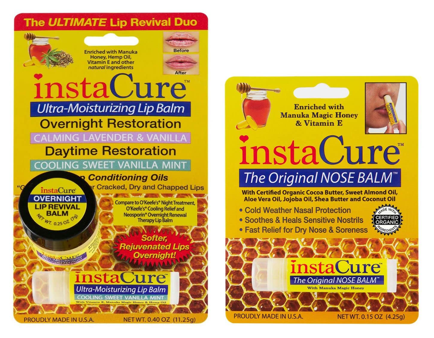 InstaCure The Original Nose Balm provides fast relief for dry, cracked, and sore noses, soothing and healing sensitive nostrils while offering cold weather nasal protection. Perfect for preventing dryness and irritation, this balm is a must-have during colder months. The package also includes the Calming Lavender Vanilla Overnight Lip Mask, a 100 natural, deep-conditioning treatment that provides intense hydration and nourishment overnight, helping restore lips to a soft and smooth condition by morning. Additionally, the Daytime Cooling Sweet Vanilla Mint Lip Balm offers all-day hydration with a blend of 9 deep-conditioning oils, providing maximum lip repair and protection against environmental stressors. Together, these products offer full lip and nose care, ensuring comfort and restoration day and night.Hydration Sticks with Multiple Deep Conditioning Oils: These ultra-moisturizing blends are the perfect remedy for cracked, dry, and chapped lips. Regular application will restore damaged lips quickly! Our honey and hemp oil balm with Vitamin E is ideal for fast, 100 natural relief, especially during flu and cold season. Great for On-the-Go: The Original NOSE BALM comes in a convenient tube that fits easily into your pocket or purse for quick nasal hydration and relief wherever you are. Keep your nostrils and surrounding areas feeling great, anytime, anywhere. Cold Weather Nose Protection: Apply a protective layer of The Original NOSE BALM around your nostrils when temperatures drop. Prevent nasal soreness and dryness before they occur. Ideal for soothing and relieving sensitive noses and sinuses. Perfect for your dog too—an effective topical healer for cracked and dry canine noses. Certified Organic Ingredients: We pledge to provide only the best for your body. This honey-based balm is all-natural and made with certified organic ingredients, including Hemp Seed Oil, Sweet Almond Oil, Aloe Vera Oil, Jojoba Oil, Shea Butter, Coconut Oil, Avocado Oil, Kukui Oil, Neem Nut Oil, Castor Oil, Rosemary Extract, Vitamin E, and Cocoa Butter. Manuka Honey Magic: Included in both products is potent therapeutic raw Manuka honey from New Zealand, known for its remarkable healing properties. It quickly helps clear skin irritations of all kinds.