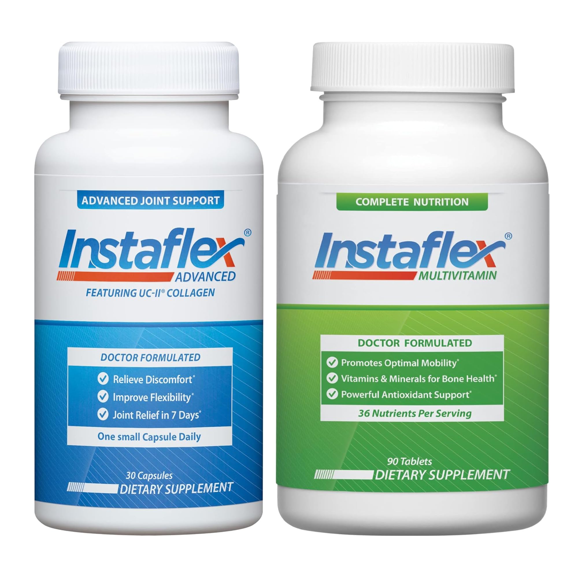 For enhanced benefits, use Instaflex Multivitamin with Instaflex Advanced, our doctor-formulated joint relief supplement. Together, they support a happy, healthy, and active lifestyle. Multivitamin: Each serving delivers 36 key nutrients, including 17 high-potency vitamins and minerals, to support stronger bones, optimal mobility, heart health, and cellular energy production. Multivitamin: Instaflex Multivitamin supports healthy aging and helps fill any nutritional gaps in your diet. It includes food and botanical-based blends, like broccoli extract, flaxseed, olive leaf, and turmeric - something you won't find in other multivitamins. Advanced: Just one small capsule a day provides fast, effective joint relief in as few as 7 days thanks to ingredients like Apr?sFlex, which helps significantly improve joint stiffness and knee discomfort. Advanced: Instaflex Advanced is doctor-formulated to provide relief in 7 days. Nowhere else can you find such an effective combination of ingredients shown to support joint health, flexibility and mobility.
