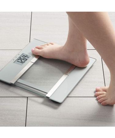 Silver and stainless steel accents highlight an accurate body composition monitor to accurately measure body fat and body water for up to 4 users. . Also calculates BMI for each user, which is the calculation doctor's offices use as it provides an overall snapshot of body health. . Tempered glass 11. 8" x 11. 8" platform accommodates most foot sizes, and yet is robust to handle up to 400 pound weight readings in 0. 2 pounds increments. Weigh only mode -- just step on to get our body weight. Batteries included and auto off function to conserve battery life.