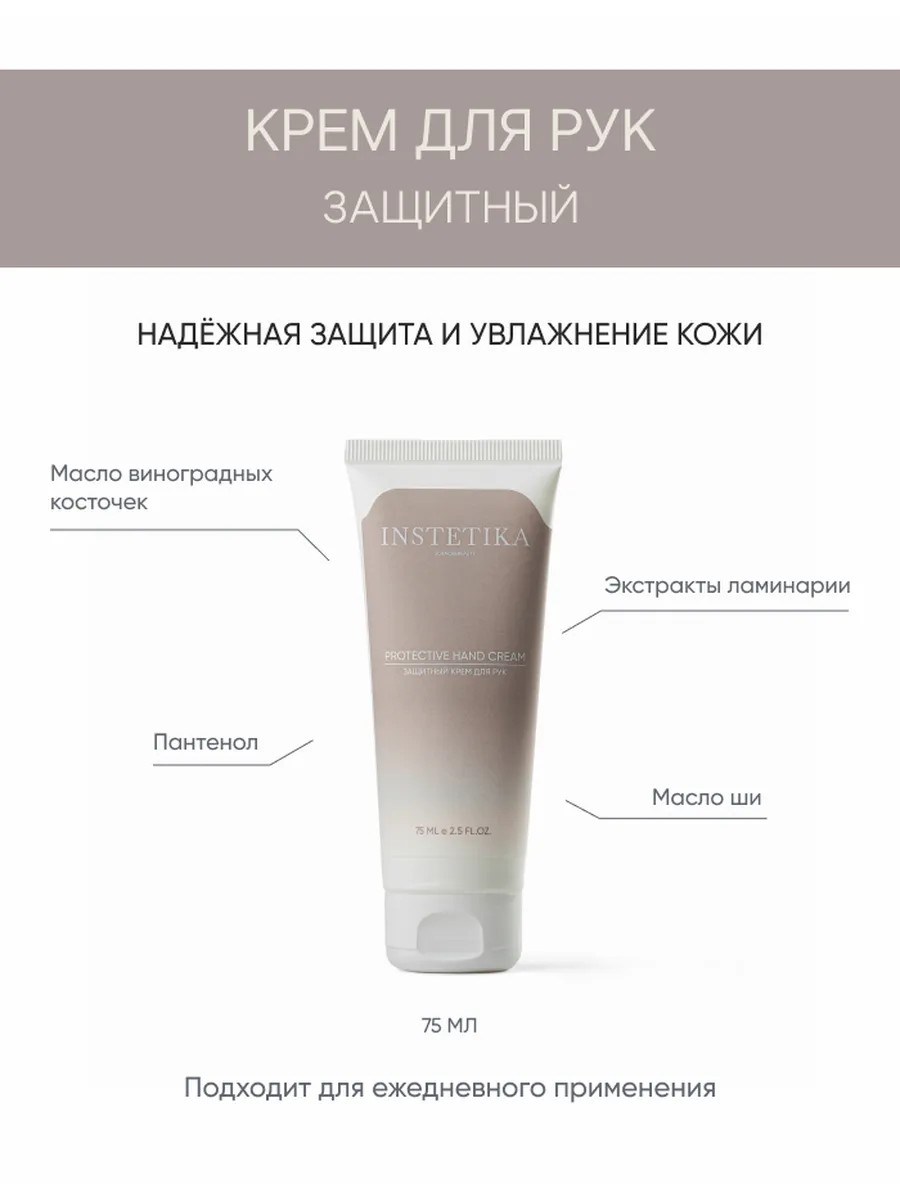 INSTETIKA's protective hand cream is designed for those who value comfort and self-care. Its formula creates an invisible barrier that protects against harsh environmental factors, keeping your skin soft and moisturized. Experience softness and protection that lasts all day. HOW TO USE: Apply a small amount of cream to clean, dry hands, massaging in.