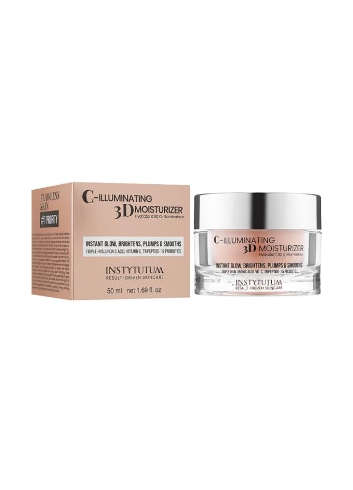Instytutum C-Illuminating 3D Moisturizer A luxurious, glow-enhancing moisturizer designed to instantly brighten, plump, and hydrate the skin. Packed with Vitamin C, Multi-Molecular Hyaluronic Acid, Tri-Peptides, Probiotics, Pomegranate, Beet Root Extract, and plant oils, it targets hyperpigmentation, fine lines, inflammation, and dullness. Its multitasking formula delivers firming, anti-aging, and anti-pollution benefits while creating a pearlescent finish. Ideal for use under makeup or alone for a radiant glow.