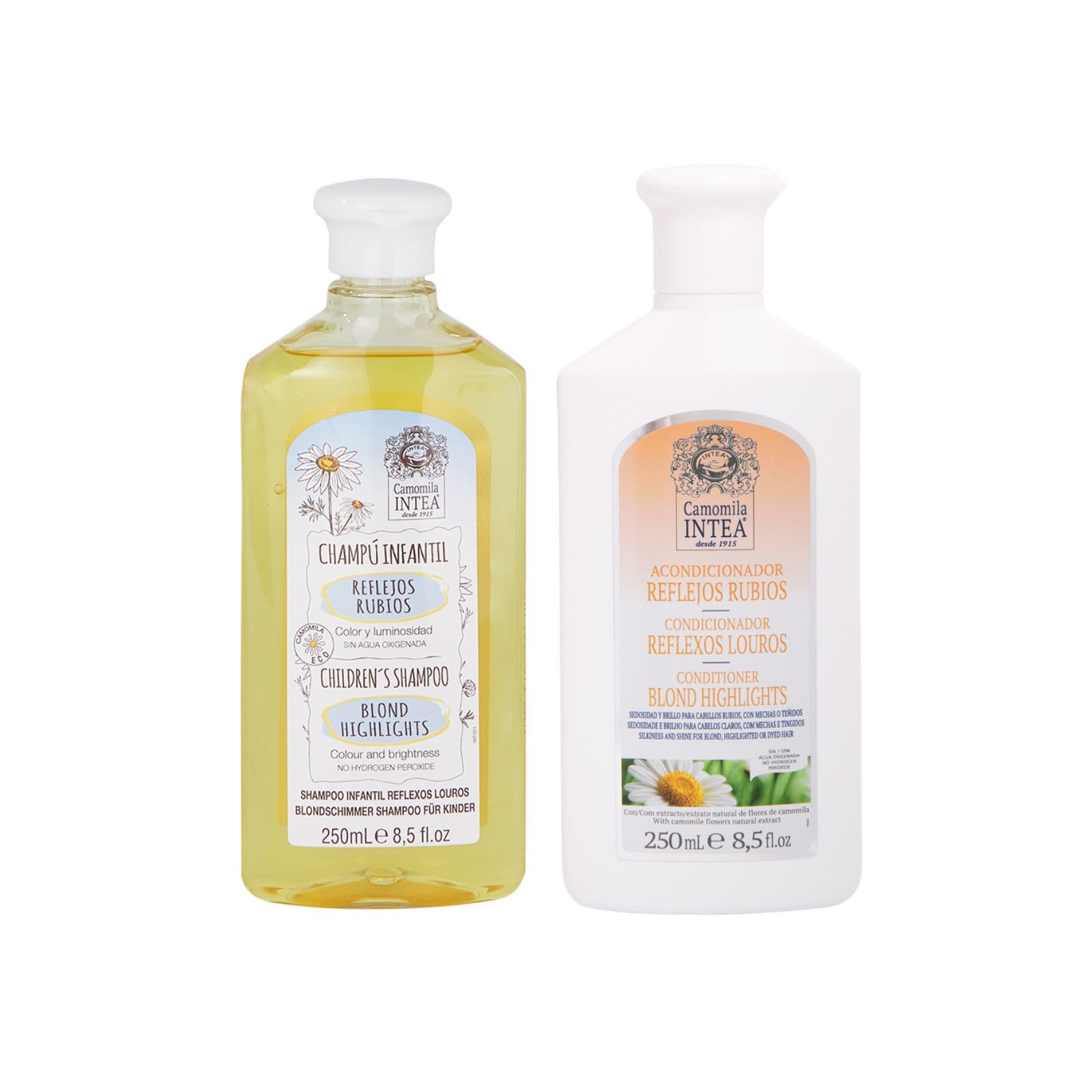 Intea Chamomile - Children's Blonde Reflex Shampoo for Blonde Hair 250ml Blonde Reflex Conditioner 250ml - With Chamomile Flower Extract INSTRUCTIONS FOR USE Apply the shampoo to wet hair, massage, and rinse. Apply the conditioner to the hair, leave on for a few minutes, and rinse. SAFETY WARNING No See more