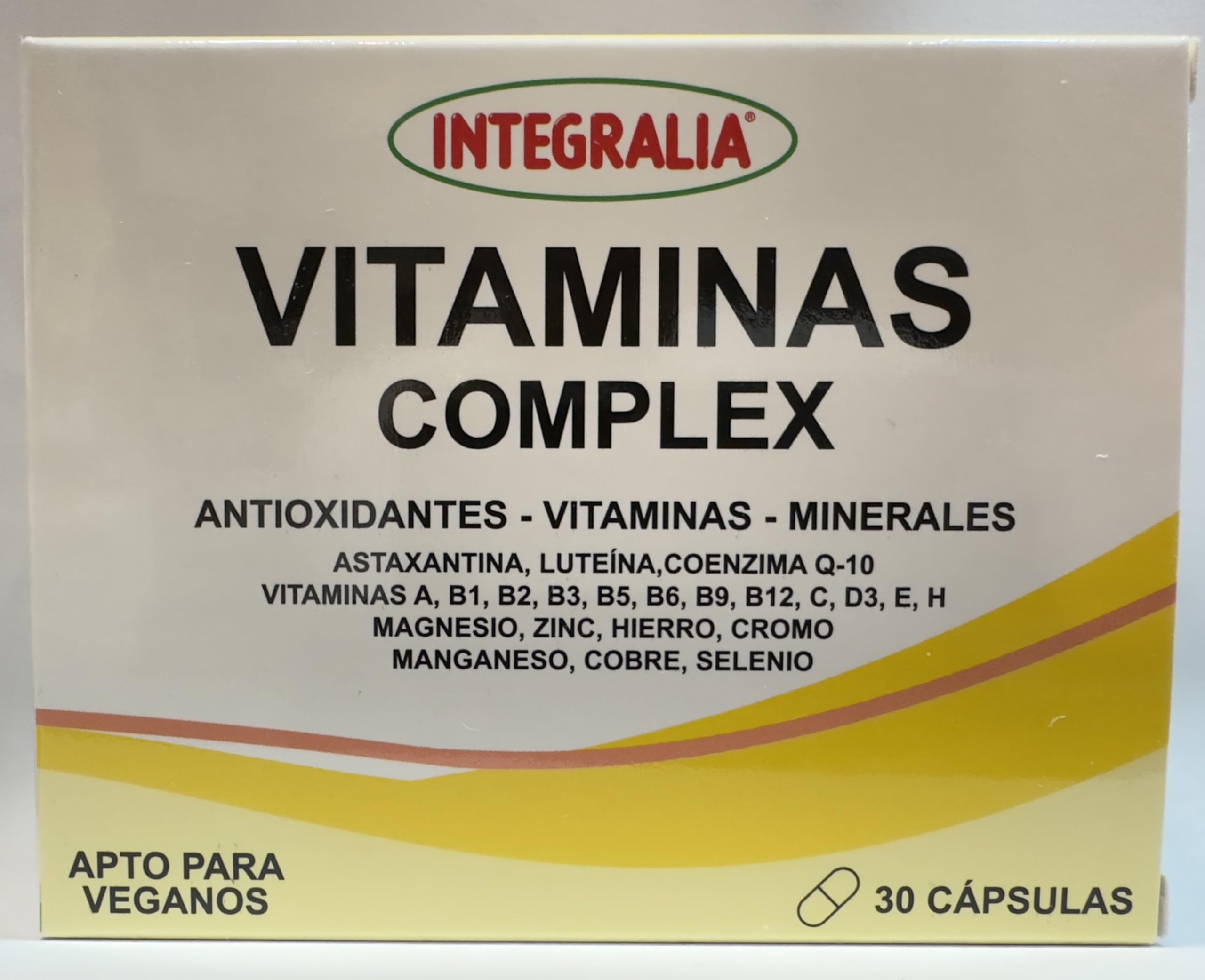 INGREDIENTS Composition per recommended daily dose: Astaxanthin 2 mg, Lutein 2.5 mg, Coenzyme Q10 10 mg, Vitamin A 800 mcg, Vitamin B1 1.1 mg, Vitamin B2 1.4 mg, Vitamin B3 16 mg, Vitamin B5 6 mg, Vitamin B6 1.4 mg, Vitamin B9 200 mcg, Vitamin B12 2.5 mcg, Vitamin C 80 mg, Vitamin D 5 mcg, Vitamin E 12 mg, Vitamin H 50 mcg, Magnesium 56.25 mg, Zinc 10 mg, Iron 14 mg, Chromium 40 mcg, Manganese 2 mg, Copper 1 mg, Selenium 555 mcg SAFETY WARNING The recommended dose should not be exceeded and is not a substitute for a varied and balanced diet. Keep out of reach of children.Item packaging dimensions: 2.4 L x 8.4 W x 10.7 H cm. Allergen information: Gluten-free. Integralia Senior Vitamin Complex. Supplemental vitamins and minerals for sudden seasonal changes, hair loss, and improved skin and nail condition. Ideal for ages 50 and up.INTEGRALIA Complex Senior Vitamines 30 CapsulesDESCRIPTION DU PRODUIT INGRÉDIENTS Composition par dose quotidienne recommandée : Astaxanthine 2 mg Lutéine 2,5 mg Coenzyme Q10 10 mg Vitamine A 800 mcg Vitamine B1 1,1 mg Vitamine B2 1,4 mg Vitamine B3 16 mg Vitamine B5 6 mg Vitamine B6 1,4 mg Vitamine B9 200 kg. mcg Vitamine B12 2,5 mcg Vitamine C 80 mg Vitamine D 5 mcg Vitamine E 12 mg Vitamine H 50 mcg Magnésium 56,25 mg Zinc 10 mg Fer 14 mg Chrome 40 mcg Manganèse 2 mg Cuivre 1 mg Sélénium 555 MCG AVERTISSEMENT DE SÉCURITÉ La dose recommandée ne doit pas être dépassée et ne remplace pas une alimentation variée et équilibrée. Tenir hors de portée des enfants.Dimensions de l'emballage de l'article: 2.4 L x 8.4 L x 10.7 H cm. Informations sur les allergènes: Sans gluten. Vitamines Complex Senior d'Integralia. Apport supplémentaire en vitamines et minéraux pour les changements saisonniers brusques, la chute des cheveux, l'amélioration de l'état de la peau et des ongles. Idéal à partir de 50 ans.
