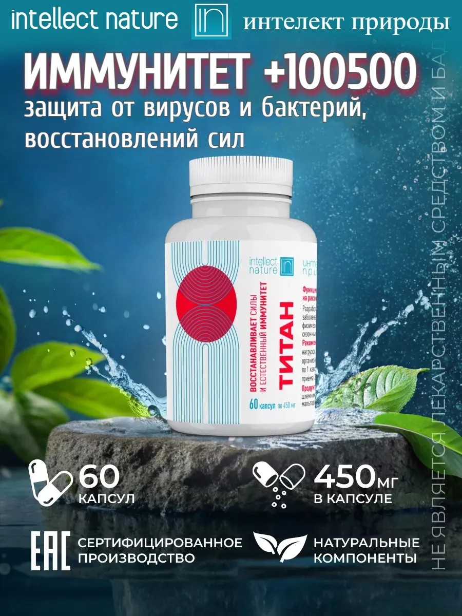 The phytoproduct "Titan" for adults from INTELLECT OF NATURE is a comprehensive dietary supplement designed to strengthen and restore the immune system, protect the body from various infections, and recover from serious illnesses. This highly effective vegan and non-GMO immune-boosting dietary product is the ideal complement to your healthy lifestyle. It contains natural extracts of marshmallow, licorice, and Baikal skullcap, as well as vitamins A, C, D, E, K, and B, providing cellular nutrition, immune support, and rapid recovery. The product's nutritional value is minimal, making it an ideal choice for those who care about their health and want to avoid excess calories.