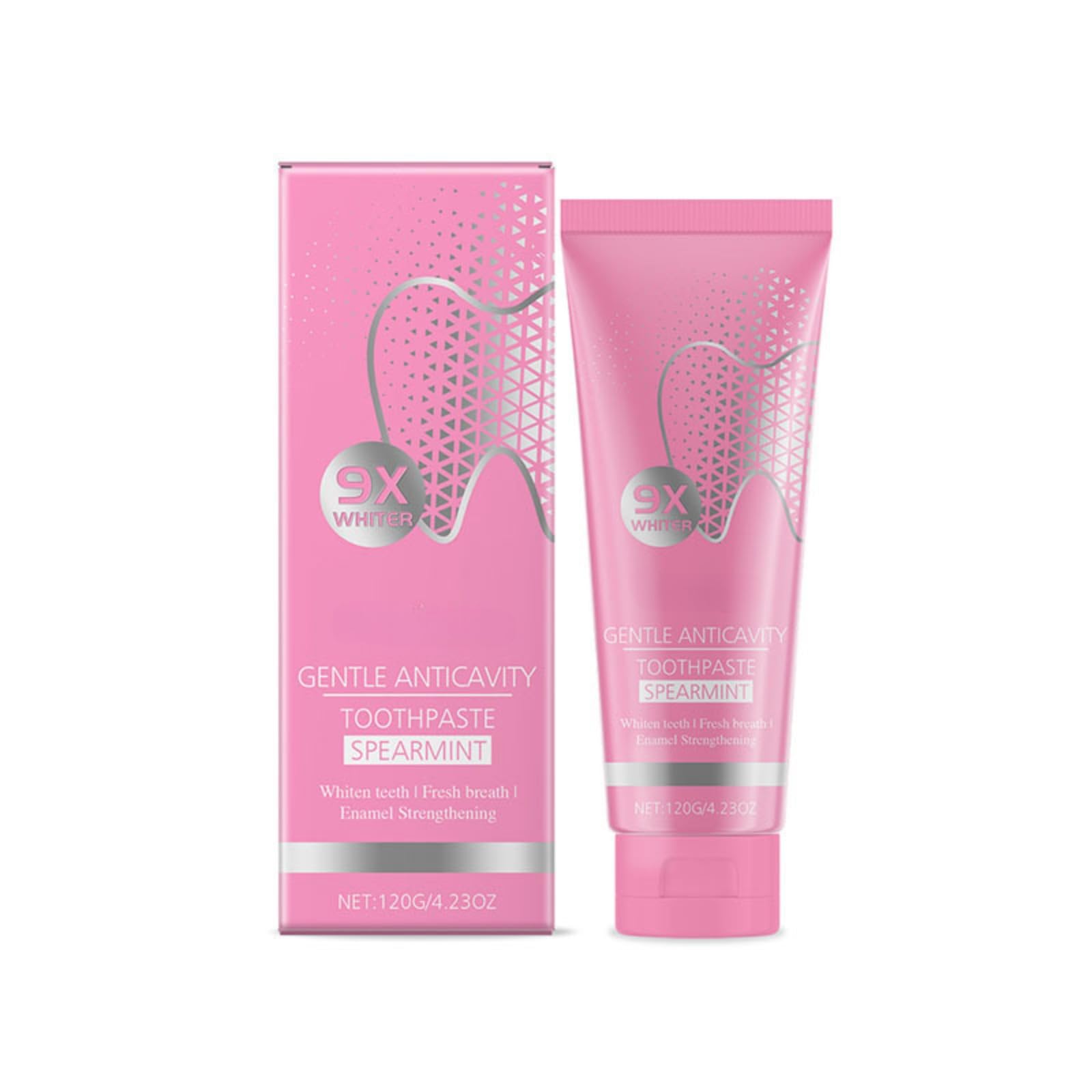 Teeth Cleaning Toothpaste, Transform your oral care routine with our Tooth - Cleaning Toothpaste, a premium product designed for comprehensive dental hygiene. Product Features: Effective Formula: Formulated with deionized water, glycerin, sodium lauryl sulfate, hydroxyethylcellulose, peppermint leaves, spearmint leaf extract, and vitamin E (tocopherol). Glycerin helps keep the paste moist and protects teeth. Sodium lauryl sulfate creates foam for effective cleaning. The mint extracts offer a refreshing flavor and contribute to oral freshness, while vitamin E provides antioxidant protection. Ideal Quantity: With a net weight of 120g, it offers sufficient usage. The packaging size is 4.6 4.6 16.3cm, and the product size is 6.3 15.8cm, making it convenient to store and handle. Benefits: Plaque Removal: Cleans the surface of teeth, reduces deposition, and keeps the mouth fresh, effectively tackling dental plaque. Tartar Inhibition: Prevents tartar accumulation, helping to maintain bright and clean teeth over time. Elevate your daily oral care with Tooth - Cleaning Toothpaste. It not only ensures a thorough clean but also promotes long - term oral health, giving you a confident, fresh smile.Our toothpaste is nature-sourced, formulated without Parabens, Gluten, phthalates, and triclosan. Infused with invigorating spearmint, our Pink Toothpaste revitalizes your breath and leaves your mouth feeling refreshed and vibrant all day long. Experience multi times more effective tone-up action, neutralizing stains and banishing yellow tones for a radiant smile. Unlock Your Brightest Smile in Just 1 Week : Witness a remarkable 9X whitening power in our clinically proven formula. Elevate your smile to an astonishing 9.65 times brighter than with regular toothpaste. Dive into the World of Intensive Whitening Pink Toothpaste : Packed with salt purity over 96 sodium chloride and essential minerals, our Toothpaste is your ultimate oral health companion for a fresher breath and brighter smile.
