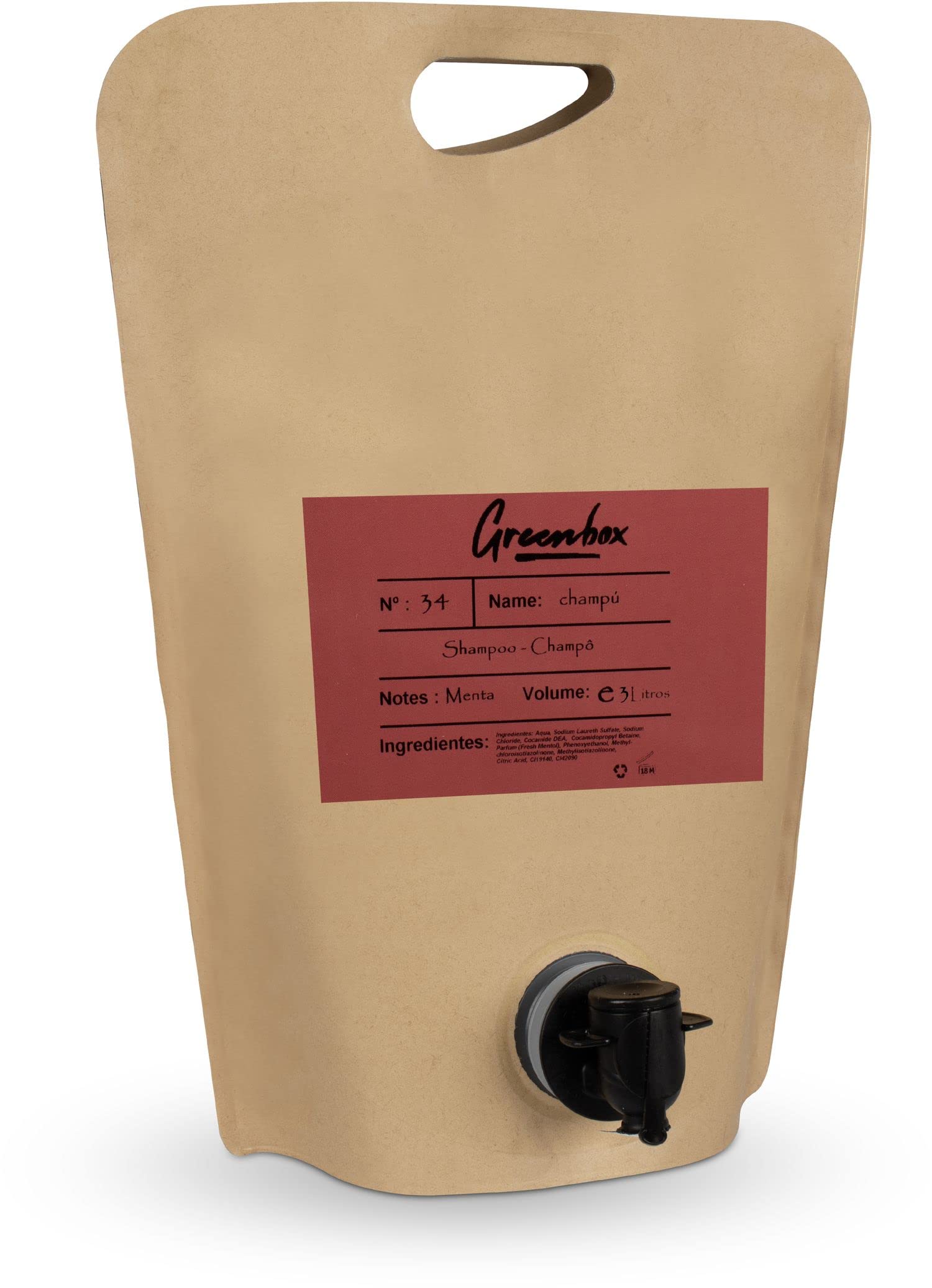 Pratique : étant donné que vous possédez un sac en boîte, vous pouvez recharger le distributeur plus facilement et moins fréquemment. Économie : contenu en plastique réduit. Équivaut à trois recharges et demie pour nos distributeurs rechargeables de 400 ml et 10 recharges complètes pour nos distributeurs remplissables d'une capacité de 300 ml. Confortable : manipulation et dosage faciles grâce au distributeur intégré. Fourni avec poignée de transport. Greenbox : « Bag in box » offre un emballage robuste, réduisant au maximum l'utilisation de récipients en plastique. Contenance : 3 litres de shampooing à la menthe de notre gamme BIO.