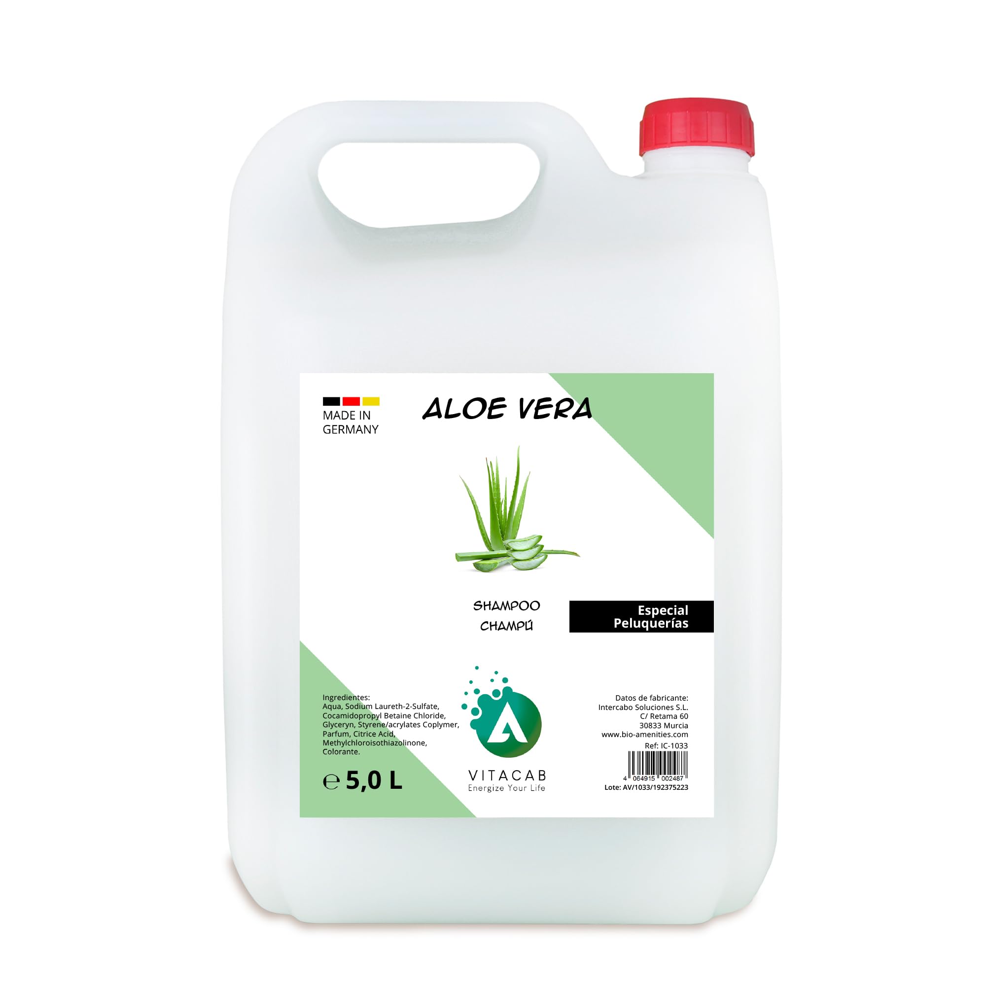 Vitacab Aloe Vera Shampoo Benefits and features of Vitacab Aloe Vera Shampoo: Professional size Capacity: It comes in a practical and economical 5 liter bottle, perfect for hairdressers and beauty salons. You always have this high-quality product at hand to meet the needs of your customers. Nourishing Ingredients: Enriched with Aloe Vera, known for its numerous hair care benefits. Repairs damaged hair, provides hydration and makes hair soft, shiny and full of life. German quality: Proud product "Made in Germany". This product has been developed and manufactured to the highest quality standards, ensuring a reliable, effective and safe shampoo. Ideal for all hair types: Whether you have dry, oily, normal hair, colored, curly or straight hair, our Aloe Vera shampoo is the perfect solution. Gently cleanses and nourishes all hair types. Eco-friendly: Biodegradable shampoo and 5 liter container that reduces the use of plastic. By choosing Vitacab, you are not only choosing a high-quality hair care product, but also a more sustainable option.Environmentally friendly: Vitacab cares about our planet. That's why we've done our best to make our shampoo biodegradable and our 5 liter packaging reduces the use of plastic. By choosing Vitacab, you are not only choosing a high-quality hair care product, but also a more sustainable option. Ideal for all hair types: Whether your clients have dry, oily, normal, colored, curly or straight hair, our Aloe Vera shampoo is the perfect solution. It is formulated to gently cleanse and nourish all hair types, leaving them healthy, manageable and radiant. German quality: Our Vitacab Aloe Vera shampoo is a proud product "Made in Germany". Germany is known worldwide for its strict regulations and high quality in the production of beauty and personal care products. This product has been developed and manufactured to the highest quality standards, ensuring a reliable, effective and safe shampoo. Nourishing Ingredients: Vitacab is committed to the health and beauty of its customers' hair. That's why our shampoo is enriched with Aloe Vera, known for its numerous hair care benefits. This powerful natural ingredient can help repair damaged hair, providing hydration and leaving hair soft, shiny and full of life. Professional size capacity: Our Vitacab Aloe Vera shampoo bottle comes in a practical and economical 5 liter container, perfectly designed for use in hairdressers and beauty salons. The size is ideal for frequent use and ensures that you always have this high-quality product on hand to meet the needs of your customers.Professionele Shampoo in Fles van 5L Aloë Vera vloeibare shampoo in industrieel formaat 5 liter Met vulmondstuk Speciaal voor Kappers 5000 ml Vitacab Aloë Vera Shampoo Voordelen en kenmerken van Vitacab Aloë Vera Shampoo: Professioneel formaat Capaciteit: Het wordt geleverd in een praktische en voordelige fles van 5 liter, perfect voor kappers en schoonheidssalons. U heeft dit hoogwaardige product altijd bij de hand om aan de behoeften van uw klanten te voldoen. Voedende ingrediënten: Verrijkt met Aloë Vera, bekend om zijn talrijke haarverzorgende voordelen. Herstelt beschadigd haar, zorgt voor hydratatie en maakt het haar zacht, glanzend en vol leven. Duitse kwaliteit: Trots product "Made in Germany". Dit product is ontwikkeld en vervaardigd volgens de hoogste kwaliteitsnormen, waardoor een betrouwbare, effectieve en veilige shampoo wordt gegarandeerd. Ideaal voor alle haartypes: Of je nu droog, vettig, normaal haar hebt gekleurd, krullend of steil haar, onze Aloë Vera shampoo is de perfecte oplossing. Reinigt en voedt alle haartypes op milde wijze. Milieuvriendelijk: Biologisch afbreekbare shampoo en container van 5 liter die het gebruik van plastic vermindert. Door voor Vitacab te kiezen, kiest u niet alleen voor een kwalitatief hoogstaand haarverzorgingsproduct, maar ook voor een duurzamere optie.Milieuvriendelijk: Vitacab geeft om onze planeet. Daarom hebben we ons best gedaan om onze shampoo biologisch afbreekbaar te maken en verminderen onze verpakkingen van 5 liter het gebruik van plastic. Door voor Vitacab te kiezen, kiest u dus niet alleen voor een kwalitatief hoogstaand haarverzorgingsproduct, maar ook voor een duurzamere optie. Ideaal voor alle haartypes: Of uw klanten nu droog, vettig, normaal, gekleurd, krullend of steil haar hebben, onze Aloë Vera-shampoo is de perfecte oplossing. Het is geformuleerd om alle haartypes zachtjes te reinigen en te voeden, waardoor ze gezond, beheersbaar en stralend blijven. Duitse kwaliteit: onze Vitacab Aloë Vera-shampoo is een trots product "Made in Germany". Duitsland staat wereldwijd bekend om zijn strenge regelgeving en hoge kwaliteit bij de productie van schoonheids- en persoonlijke verzorgingsproducten. Dit product is ontwikkeld en vervaardigd volgens de hoogste kwaliteitsnormen, waardoor een betrouwbare, effectieve en veilige shampoo wordt gegarandeerd. Voedende ingrediënten: Vitacab zet zich in voor de gezondheid en schoonheid van het haar van haar klanten. Daarom is onze shampoo verrijkt met Aloë Vera, bekend om zijn talrijke haarverzorgende voordelen. Dit krachtige natuurlijke ingrediënt kan beschadigd haar helpen herstellen, zorgt voor hydratatie en maakt het haar zacht, glanzend en vol leven. Capaciteit van professioneel formaat: onze Vitacab Aloë Vera shampoofles wordt geleverd in een praktische en voordelige container van 5 liter, perfect ontworpen voor gebruik in kappers en schoonheidssalons. Het formaat is ideaal voor veelvuldig gebruik en zorgt ervoor dat u dit hoogwaardige product altijd bij de hand heeft om aan de behoeften van uw klanten te voldoen.
