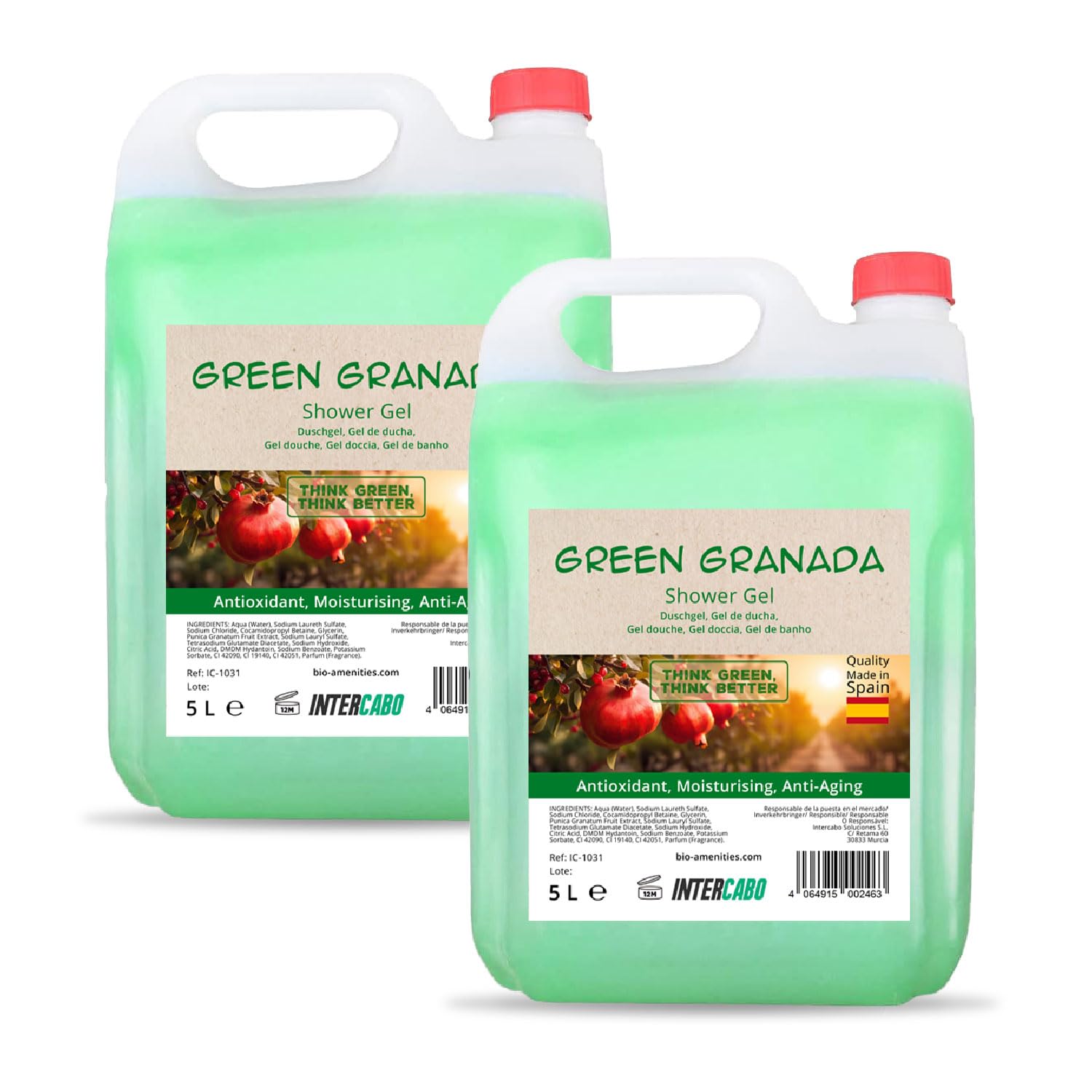 Enjoy a refreshing and gentle cleansing with Intercabo Pomegranate Shower Gel 5L, developed to thoroughly cleanse the skin and hydrate it for a long time. The fruity scent of pomegranate provides a pleasant and relaxing experience with every use. Advantages of the formula: The mild and pH-neutral composition respects the natural balance of the skin. Thanks to the moisturizing ingredients, dehydration is prevented and the skin remains soft, fresh and supple, even with daily use. Practical and sustainable: The 5L format is ideal for those looking for an economical and environmentally friendly solution. Perfect for filling refill dispensers, reducing plastic consumption and waste. Usage: Apply a small amount to a sponge or directly to the skin, massage gently and then rinse with water. Suitable for all skin types. Transform your daily routine into a moment of care and freshness with Intercabo Pomegranate Shower Gel – where softness and hydration come together. SAFETY WARNING All for external use. Avoid contact with the eyesVersatile use: Suitable for all skin types and easy to use in any bathroom or washroom. Combines softness, freshness and comfort. ? Large Refill Pack: The 5L bottles reduce plastic waste and make refilling easy - a sustainable and economical choice for long-term use. Fruity scent: The wonderful garnet scent leaves a subtle and long-lasting freshness on the skin, making every shower a moment of well-being. Moisturizing formula: Thanks to the mild and caring composition, the skin remains supple and hydrated, ideal for daily use by the whole family. Gentle cleansing: The Intercabo Pomegranate Shower Gel removes impurities without drying out the skin and provides a fresh and clean sensation after every shower.Granaatappel Douchegel – 2 x 5L – Zachte reiniging en diepe hydratatie – Fruitige granaatgeur – Grote navulverpakking voor langdurige frisheid en dagelijks gebruik Geniet van een verfrissende en zachte reiniging met Intercabo Granaatappel Douchegel 5L, ontwikkeld om de huid grondig te reinigen en langdurig te hydrateren. De fruitige geur van granaatappel biedt een aangename en ontspannende ervaring bij elk gebruik. Voordelen van de formule: De milde en pH-neutrale samenstelling respecteert de natuurlijke balans van de huid. Dankzij de hydraterende ingrediënten wordt uitdroging voorkomen en blijft de huid zacht, fris en soepel, zelfs bij dagelijks gebruik. Praktisch en duurzaam: Het 5L-formaat is ideaal voor wie op zoek is naar een economische en milieuvriendelijke oplossing. Perfect om navuldispensers te vullen, waardoor plasticverbruik en afval worden verminderd. Gebruik: Breng een kleine hoeveelheid aan op een spons of direct op de huid, masseer zachtjes en spoel vervolgens af met water. Geschikt voor alle huidtypes. Transformeer uw dagelijkse routine in een moment van verzorging en frisheid met Intercabo Granaatappel Douchegel – waar zachtheid en hydratatie samenkomen. VEILIGHEIDSWAARSCHUWING Allen voor extern gebruik. Vermijd contact met de ogenVeelzijdig gebruik: Geschikt voor alle huidtypes en gemakkelijk te gebruiken in elke badkamer of wasruimte. Combineert zachtheid, frisheid en comfort. ? Grote navulverpakking: De 5L flessen verminderen plastic afval en maken navullen eenvoudig – een duurzame en economische keuze voor langdurig gebruik. Fruitige geur: De heerlijke granaatgeur laat een subtiele en langdurige frisheid achter op de huid, waardoor elke douche een moment van welzijn wordt. Hydraterende formule: Dankzij de milde en verzorgende samenstelling blijft de huid soepel en gehydrateerd, ideaal voor dagelijks gebruik door het hele gezin. Zachte reiniging: De Intercabo Granaatappel Douchegel verwijdert onzuiverheden zonder de huid uit te drogen en zorgt voor een frisse en schone sensatie na elke douche.