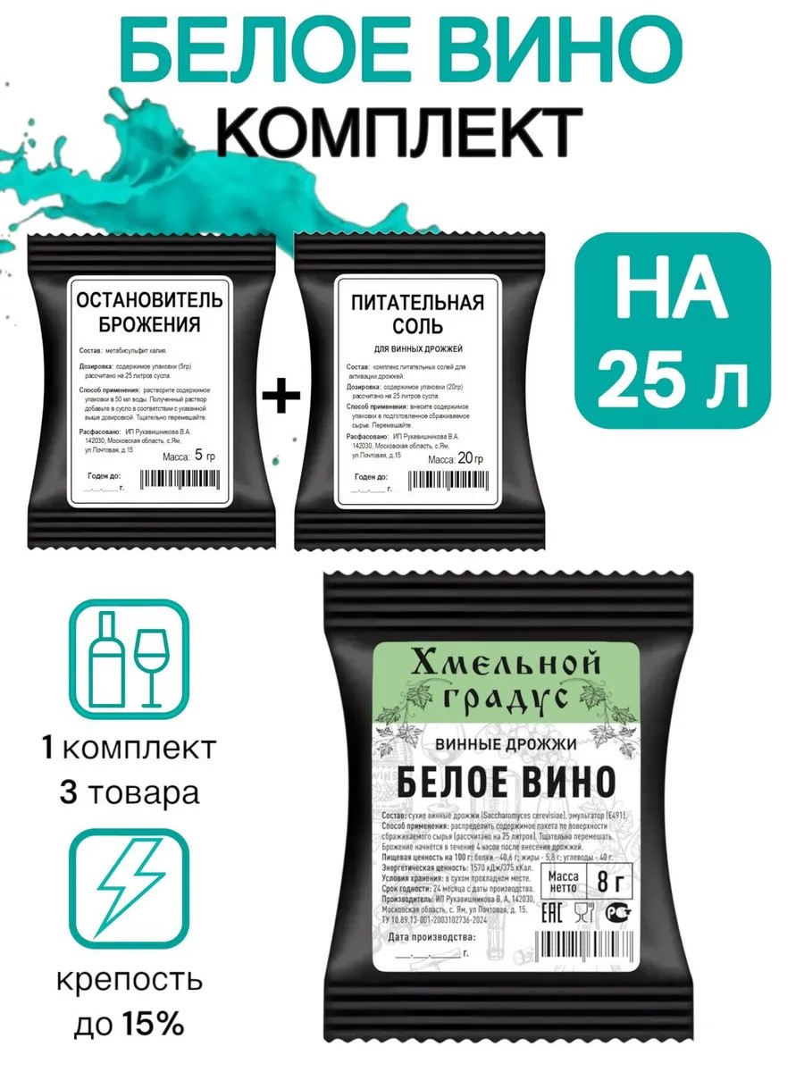 | Комплектация | Дрожжи для белого вина Хмельной Градус - 1 шт; Питательная соль (Macroferm start); Остановитель брожения (Метабисульфит калия) |