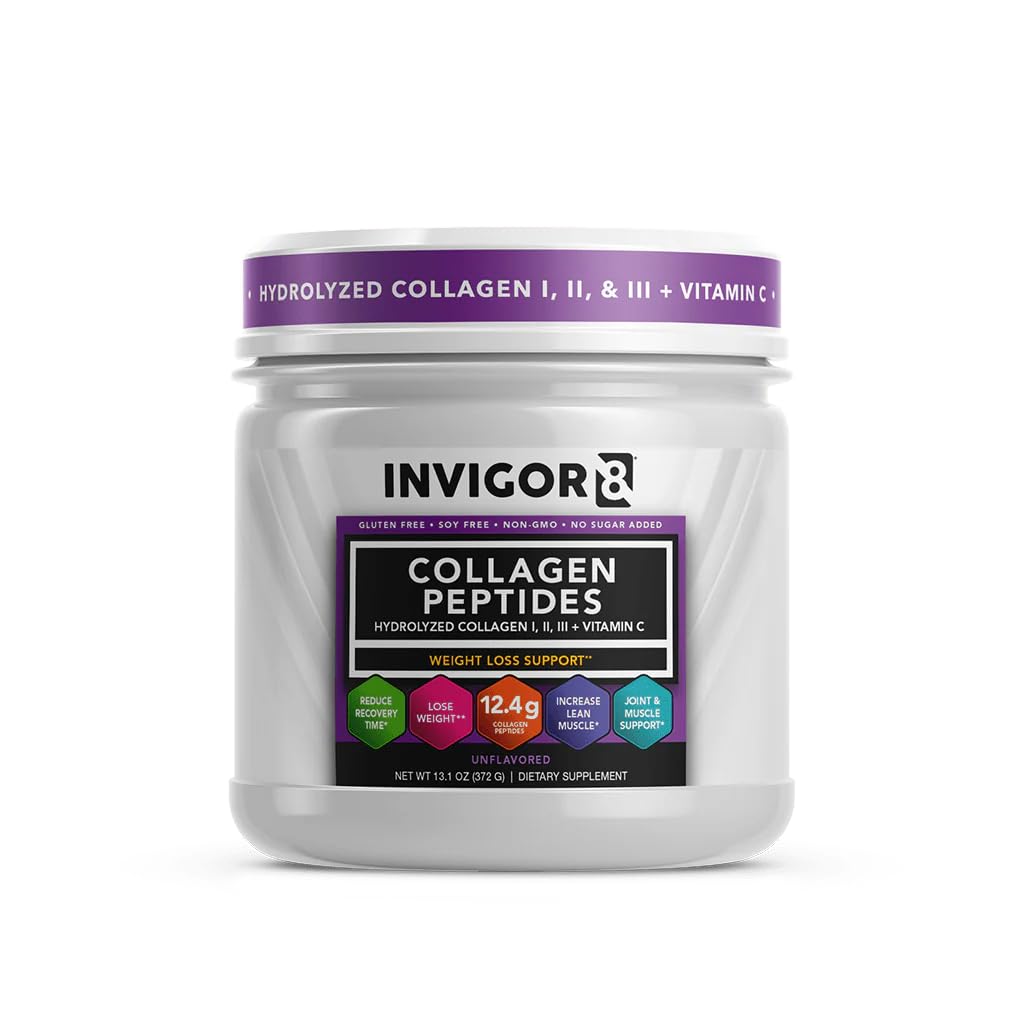 SUPPORTS SKIN, JOINT HAIR HEALTH – INVIGOR8's bioavailable collagen blend is formulated with a variety of collagen peptides to support the health of skin, joints, hair, tendons, and ligaments—helping you feel confident from the inside out. EASY-TO-MIX, UNFLAVORED FORMULA – Designed for everyday convenience, our collagen powder dissolves quickly and easily into your favorite beverage—without added flavor—so you can enjoy it anytime, anywhere. WITH MICROENCAPSULATED VITAMIN C – Our unique formula includes microencapsulated Vitamin C, which helps support collagen production and helps maintain its potency as it moves through your digestive system. SCIENCE-DRIVEN INGREDIENTS – Crafted using scientifically reviewed ingredients to help support your body's natural collagen synthesis, promoting a vibrant, well-nourished appearance when combined with a healthy lifestyle. CRAFTED IN THE USA – Proudly produced in an FDA-registered facility in Southern California, INVIGOR8 collagen is made with premium-quality ingredients and uncompromising standards.CRAFTED IN THE USA – Proudly produced in an FDA-registered facility in Southern California, INVIGOR8 collagen is made with premium-quality ingredients and uncompromising standards. SCIENCE-DRIVEN INGREDIENTS – Crafted using scientifically reviewed ingredients to help support your body's natural collagen synthesis, promoting a vibrant, well-nourished appearance when combined with a healthy lifestyle. WITH MICROENCAPSULATED VITAMIN C – Our unique formula includes microencapsulated Vitamin C, which helps support collagen production and helps maintain its potency as it moves through your digestive system. EASY-TO-MIX, UNFLAVORED FORMULA – Designed for everyday convenience, our collagen powder dissolves quickly and easily into your favorite beverage—without added flavor—so you can enjoy it anytime, anywhere. SUPPORTS SKIN, JOINT HAIR HEALTH – INVIGOR8's bioavailable collagen blend is formulated with a variety of collagen peptides to support the health of skin, joints, hair, tendons, and ligaments—helping you feel confident from the inside out.