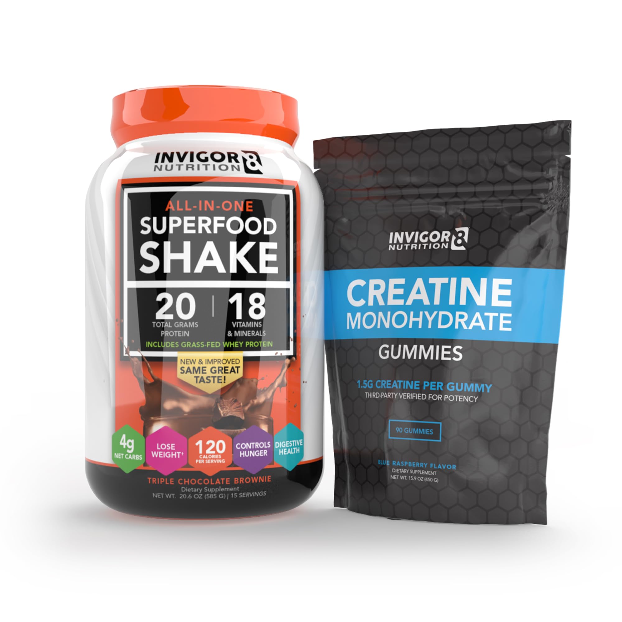SAVE MORE WITH THE COMPLETE BUNDLE – Get two top-rated Invigor8 products together for 89.99 — a total-body nutrition system designed for serious results and everyday wellness. DELICIOUS, CONVENIENT, AND SATISFYING – Enjoy a rich chocolate shake that doubles as a meal replacement, and chewable creatine gummies that taste amazing — perfect for any time of day. CLEAN, SCIENCE-BACKED NUTRITION – Non-GMO, gluten-free, and free of artificial ingredients. Both products are formulated to support clean energy, balanced nutrition, and optimal digestion. BUILD LEAN MUSCLE, FASTER – The shake fuels muscle repair with 20g of clean protein per serving, while the gummies enhance strength and recovery through pure creatine monohydrate — no powders, no mess. COMPLETE MUSCLE RECOVERY SUPPORT – Pairing Invigor8's Chocolate Superfood Shake with our Creatine Gummies delivers a powerhouse combination of protein, superfoods, and muscle-fueling creatine for next-level performance.